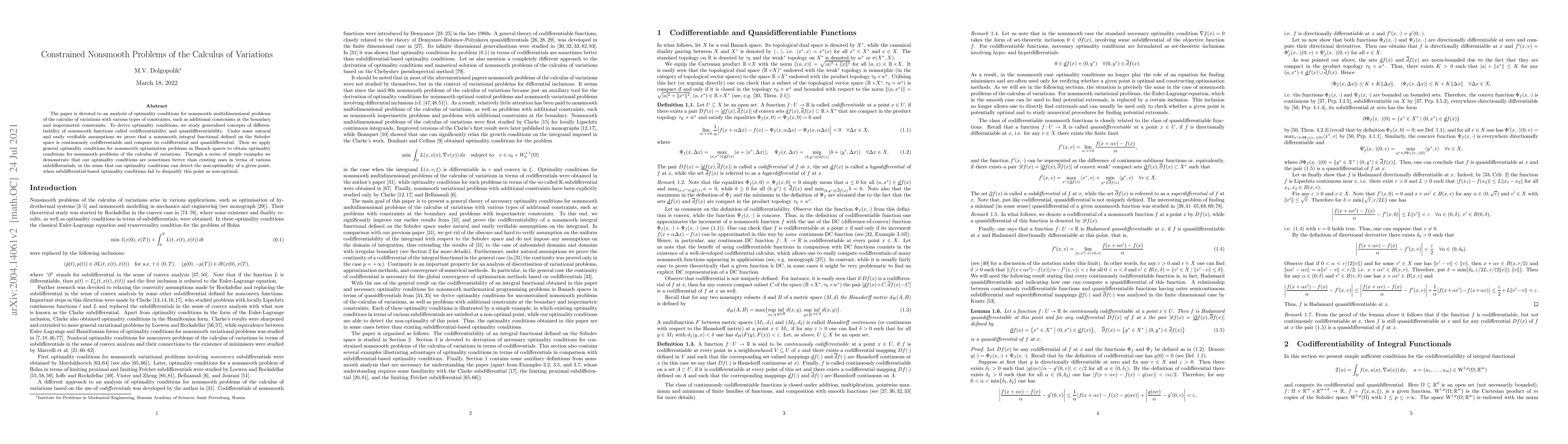 This paper analyzes optimality conditions for nonsmooth multidimensional calculus of variations problems with various constraints, deriving new conditions using codifferentiability and quasidifferentiability. The authors demonstrate that their conditions outperform existing subdifferential-based methods in detecting non-optimality.