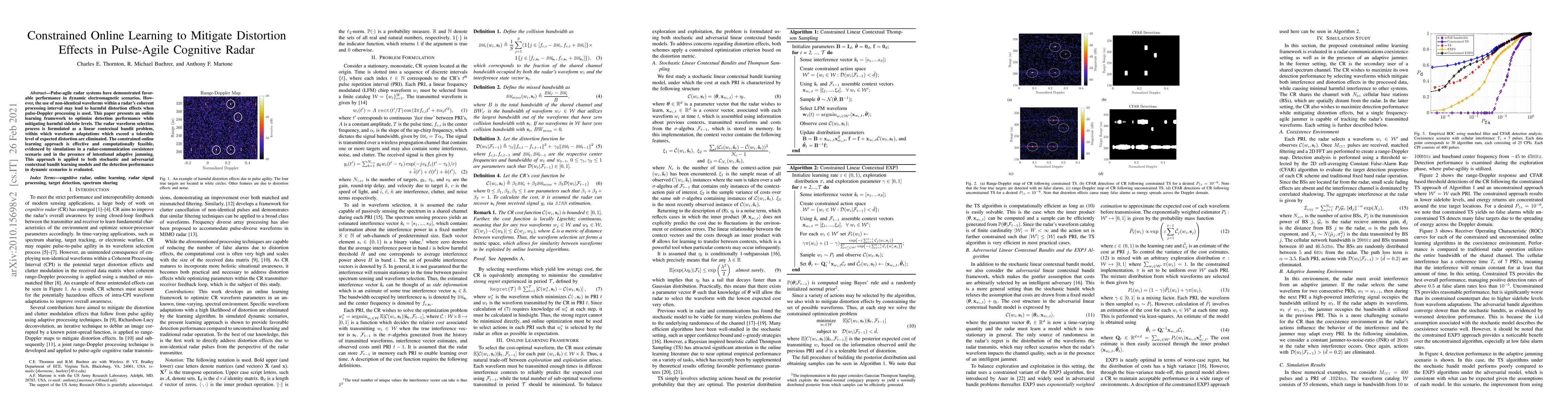 This paper proposes an online learning framework to optimize pulse-agile cognitive radar performance by mitigating distortion effects from non-identical waveforms. The approach formulates waveform selection as a constrained linear contextual bandit problem, ensuring adaptation does not exceed tolerable distortion levels, and demonstrates effectiveness in radar-communication coexistence and jamming scenarios.