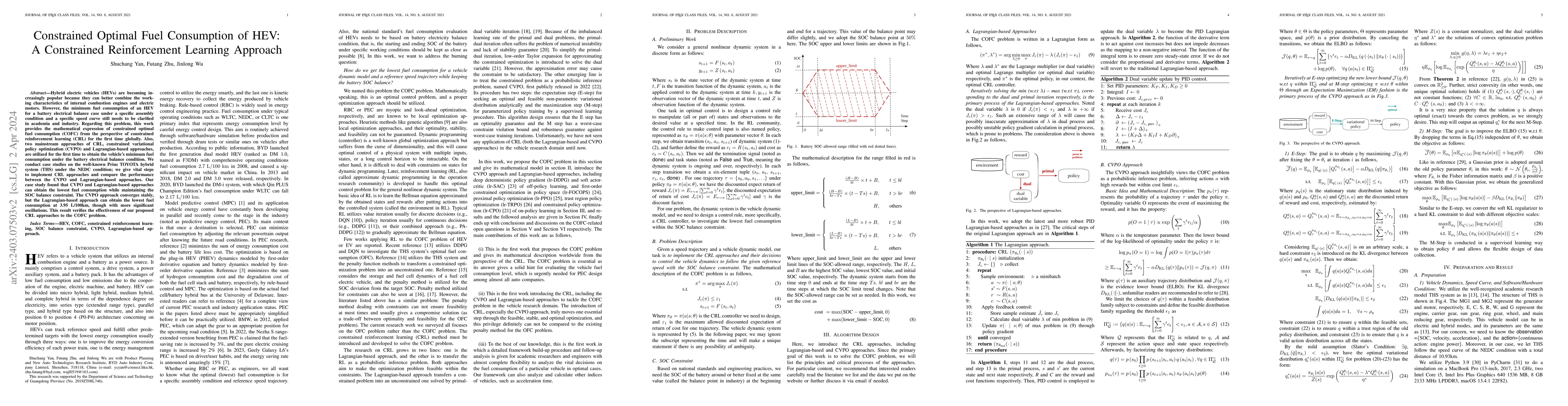 This paper proposes constrained reinforcement learning approaches to determine the constrained optimal fuel consumption (COFC) for hybrid electric vehicles (HEVs). Utilizing constrained variational policy optimization (CVPO) and Lagrangian-based methods, the study achieves minimum fuel consumption while maintaining battery electrical balance, demonstrating effectiveness through a case study on the Prius hybrid system under NEDC conditions.