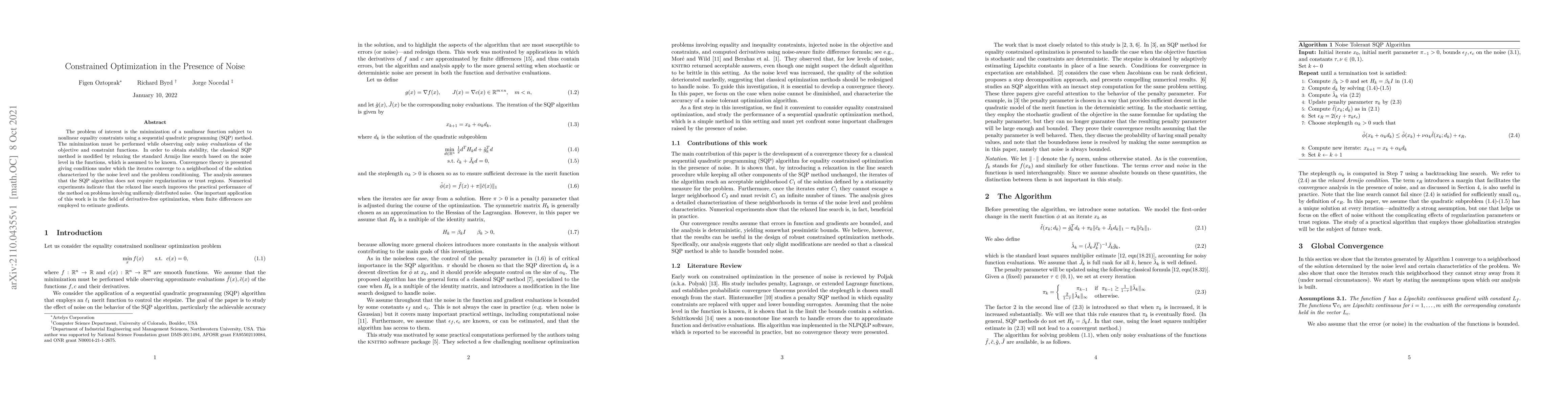 This research modifies the Sequential Quadratic Programming (SQP) method for minimizing nonlinear functions with noisy evaluations of objective and constraint functions. The modification involves relaxing the Armijo line search based on noise level knowledge, ensuring convergence to a solution neighborhood characterized by noise and problem conditioning. The method shows improved performance in numerical experiments with uniform noise, particularly beneficial in derivative-free optimization using finite differences for gradient estimation.