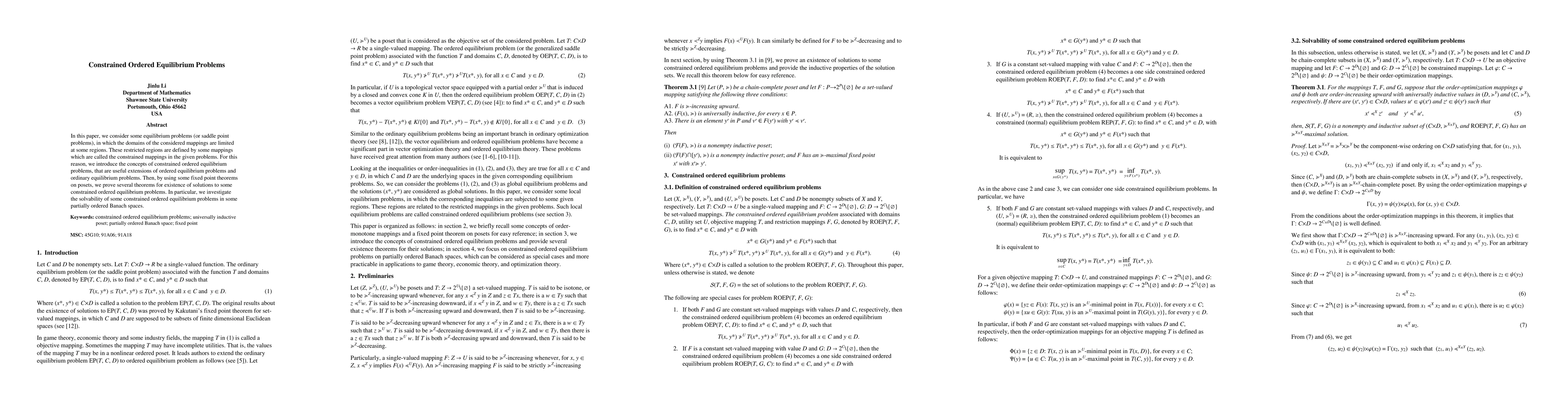 This paper introduces constrained ordered equilibrium problems, extending ordinary equilibrium problems, and proves existence theorems for solutions in partially ordered Banach spaces using fixed point theorems on posets.