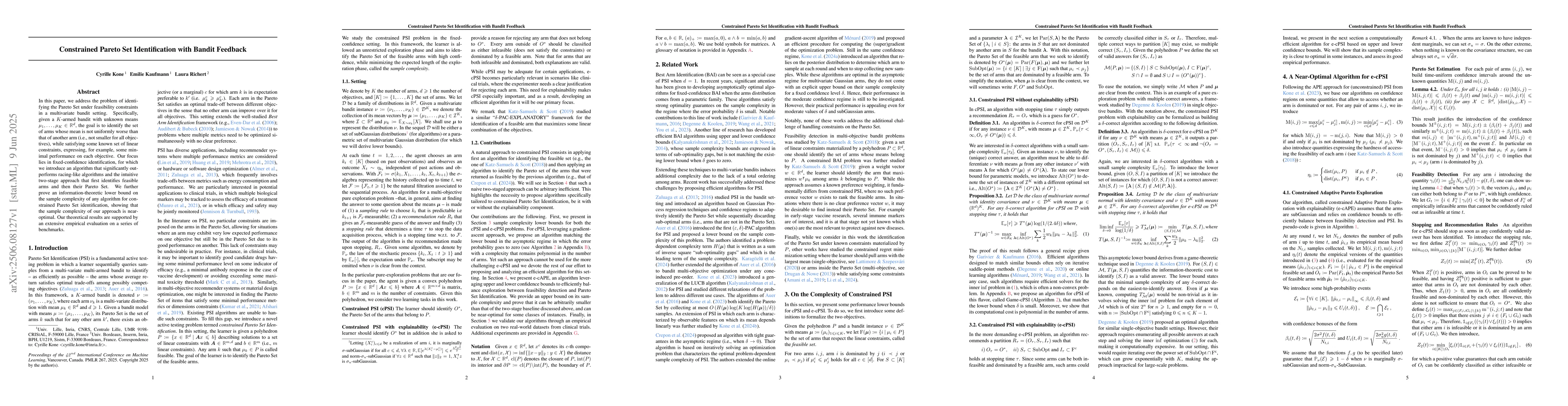 This paper introduces an algorithm for identifying the Pareto Set of arms in a multivariate bandit setting with feasibility constraints, outperforming existing methods and achieving near-optimal sample complexity.