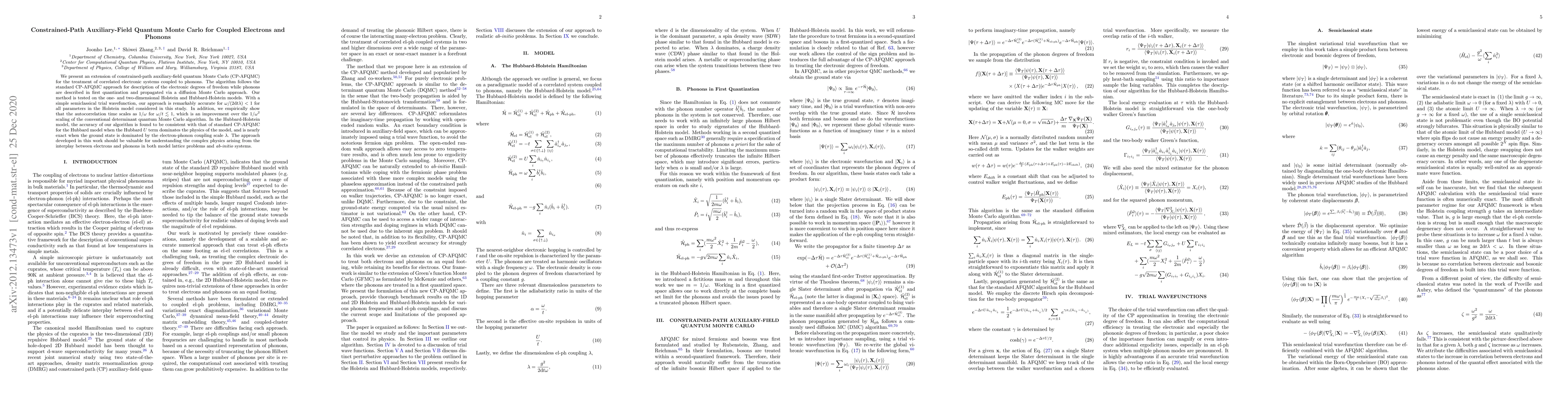 This paper extends the constrained-path auxiliary-field quantum Monte Carlo (CP-AFQMC) method to study correlated electron systems coupled with phonons. The phonons are treated via a diffusion Monte Carlo approach, demonstrating improved autocorrelation time scaling compared to conventional methods.