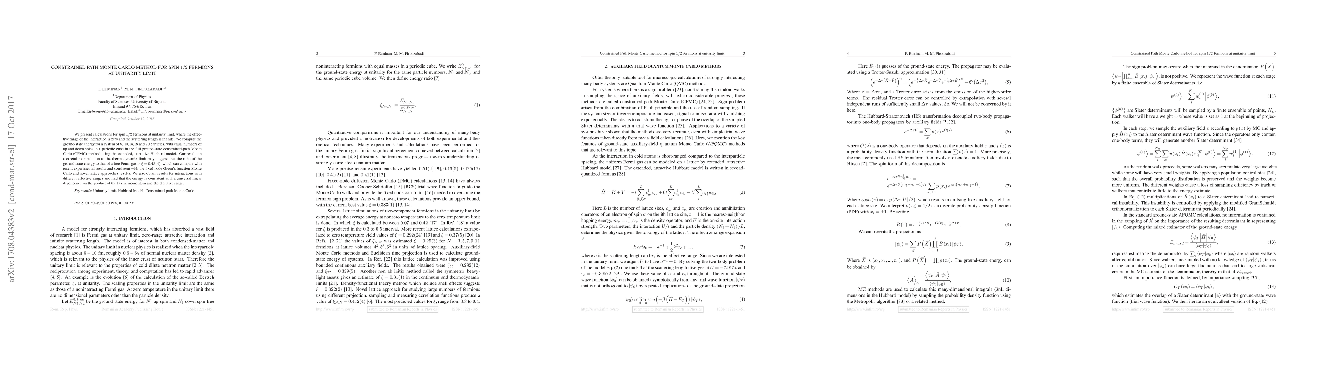 We present calculations for spin $ 1/2 $ fermions at unitarity limit, where the effective range of the interaction is zero and the scattering length is infinite. We compute the ground-state energy for a system of 6, 10,14,18 and 20 particles, with equal numbers of up and down spins in a periodic cube in the full ground-state constrained-path Monte Carlo (CPMC) method using the extended, attractive Hubbard model. Our results in a careful extrapolation to the thermodynamic limit may suggest that the ratio of the ground-state energy to that of a free Fermi gas is $ \xi = 0.43(4) $, which can compare with recent experimental results and consistent with the fixed node Green's function Monte Carlo and novel lattice approaches results. We also obtain results for interactions with different effective ranges and find that the energy is consistent with a universal linear dependence on the product of the Fermi momentum and the effective range.