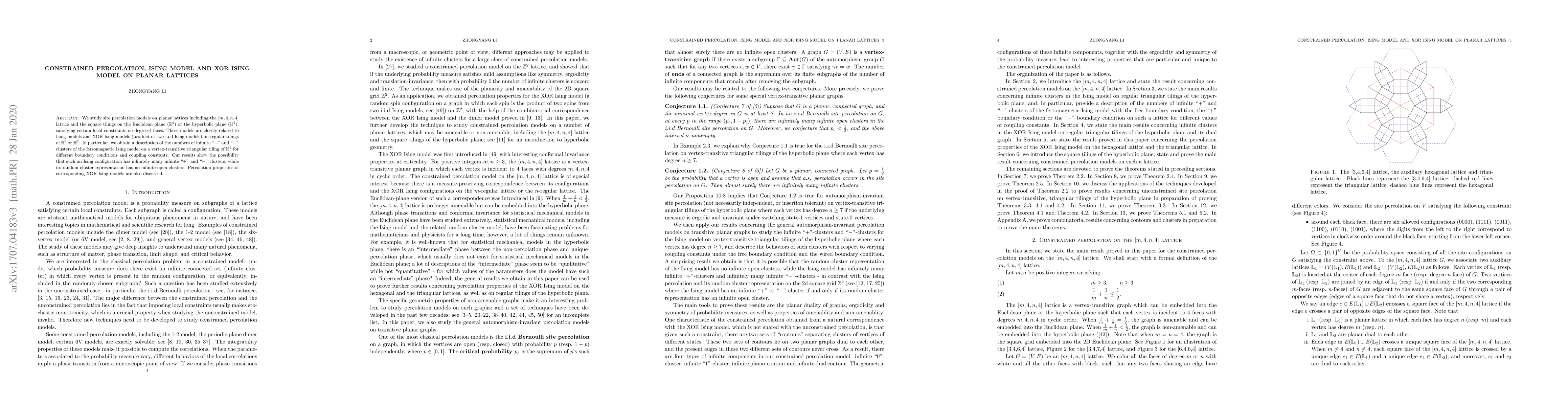 The paper presents a detailed analysis of constrained percolation models, linking them to Ising and XOR Ising models, and proving key results about the existence and nature of infinite clusters in these models on planar lattices.