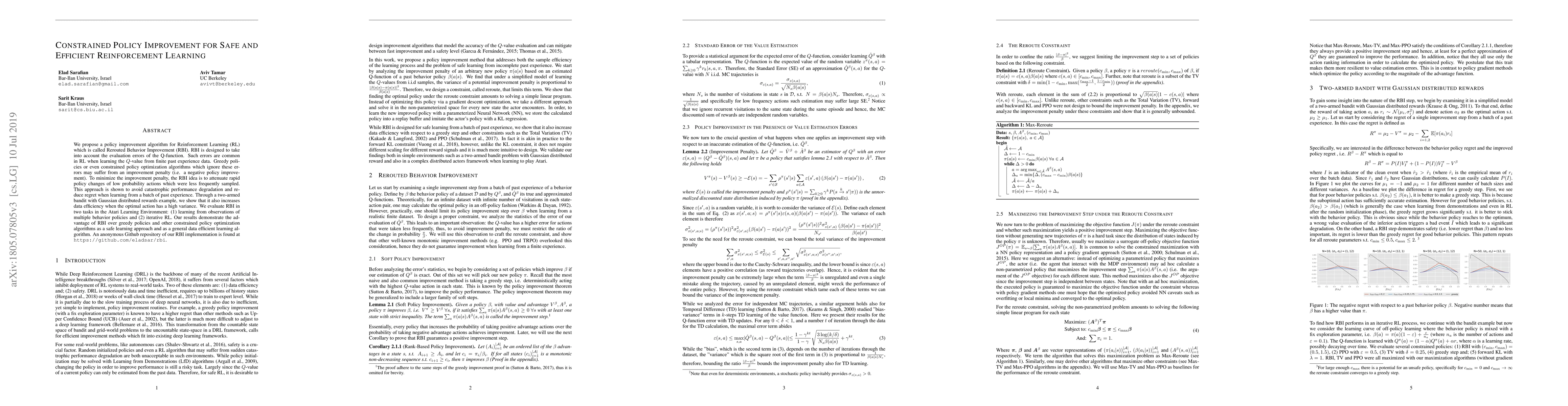 We propose a policy improvement algorithm for Reinforcement Learning (RL) which is called Rerouted Behavior Improvement (RBI). RBI is designed to take into account the evaluation errors of the Q-function. Such errors are common in RL when learning the $Q$-value from finite past experience data. Greedy policies or even constrained policy optimization algorithms which ignore these errors may suffer from an improvement penalty (i.e. a negative policy improvement). To minimize the improvement penalty, the RBI idea is to attenuate rapid policy changes of low probability actions which were less frequently sampled. This approach is shown to avoid catastrophic performance degradation and reduce regret when learning from a batch of past experience. Through a two-armed bandit with Gaussian distributed rewards example, we show that it also increases data efficiency when the optimal action has a high variance. We evaluate RBI in two tasks in the Atari Learning Environment: (1) learning from observations of multiple behavior policies and (2) iterative RL. Our results demonstrate the advantage of RBI over greedy policies and other constrained policy optimization algorithms as a safe learning approach and as a general data efficient learning algorithm. An anonymous Github repository of our RBI implementation is found at https://github.com/eladsar/rbi.