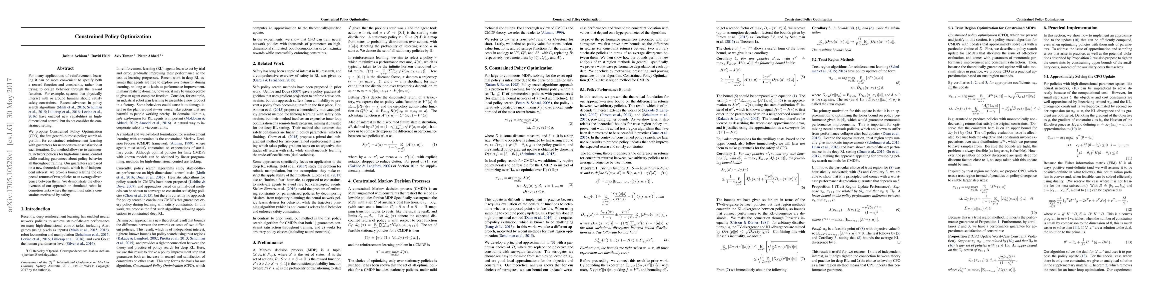 For many applications of reinforcement learning it can be more convenient to specify both a reward function and constraints, rather than trying to design behavior through the reward function. For example, systems that physically interact with or around humans should satisfy safety constraints. Recent advances in policy search algorithms (Mnih et al., 2016, Schulman et al., 2015, Lillicrap et al., 2016, Levine et al., 2016) have enabled new capabilities in high-dimensional control, but do not consider the constrained setting. We propose Constrained Policy Optimization (CPO), the first general-purpose policy search algorithm for constrained reinforcement learning with guarantees for near-constraint satisfaction at each iteration. Our method allows us to train neural network policies for high-dimensional control while making guarantees about policy behavior all throughout training. Our guarantees are based on a new theoretical result, which is of independent interest: we prove a bound relating the expected returns of two policies to an average divergence between them. We demonstrate the effectiveness of our approach on simulated robot locomotion tasks where the agent must satisfy constraints motivated by safety.