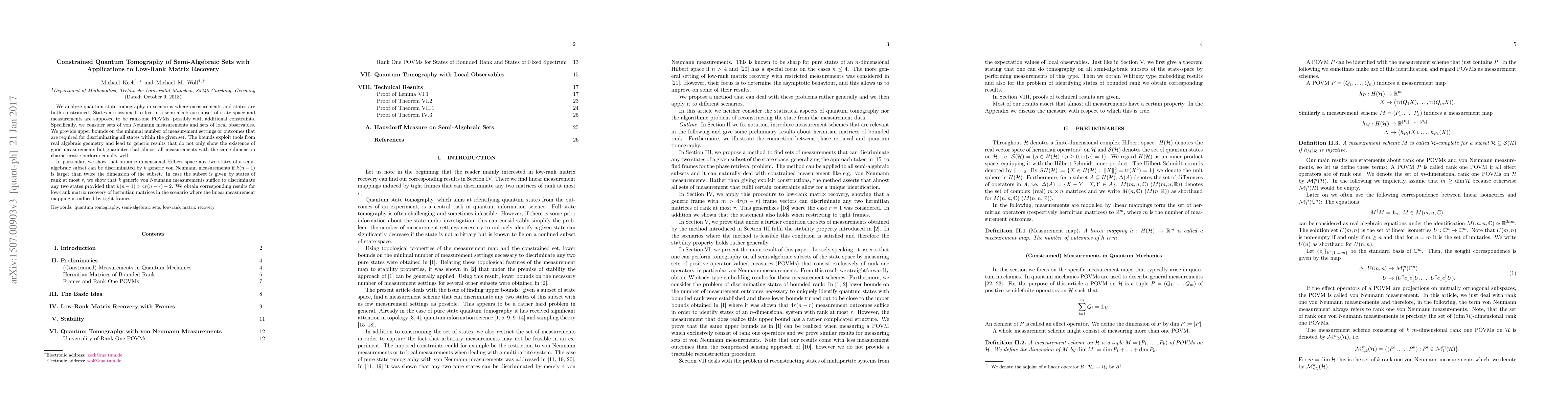 Researchers developed a method for constrained quantum tomography that can discriminate between states in semi-algebraic sets using minimal measurements, with implications for low-rank matrix recovery.