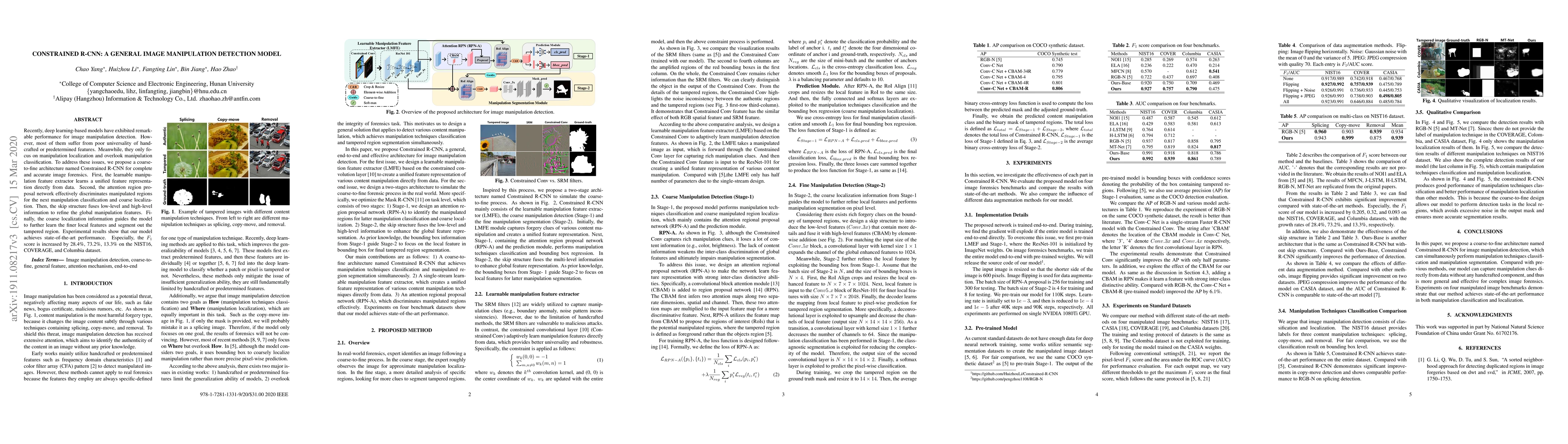 Here's a concise summary of the research paper: This paper introduces Constrained R-CNN, a novel deep learning model designed for comprehensive image manipulation detection. It addresses the limitations of existing models by employing a coarse-to-fine architecture that enhances both manipulation classification and localization, achieving superior performance across multiple datasets.