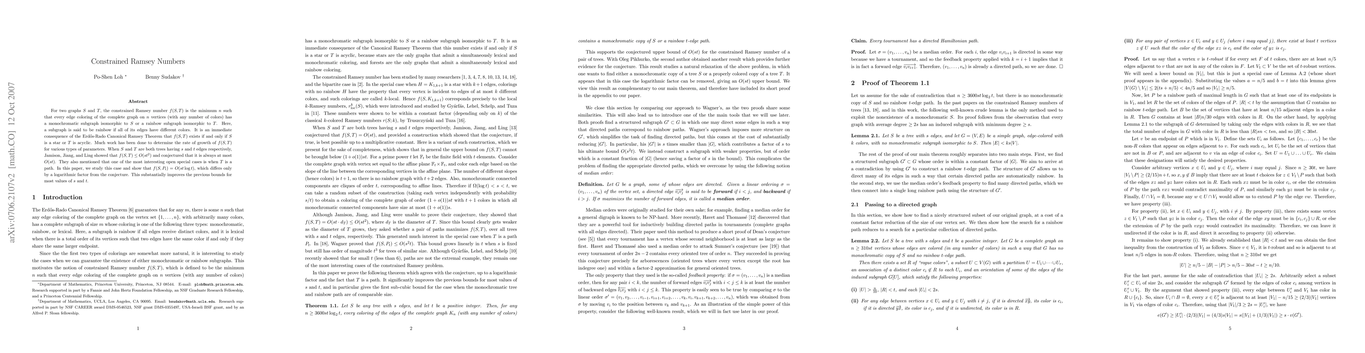 For two graphs S and T, the constrained Ramsey number f(S, T) is the minimum n such that every edge coloring of the complete graph on n vertices, with any number of colors, has a monochromatic subgraph isomorphic to S or a rainbow (all edges differently colored) subgraph isomorphic to T. The Erdos-Rado Canonical Ramsey Theorem implies that f(S, T) exists if and only if S is a star or T is acyclic, and much work has been done to determine the rate of growth of f(S, T) for various types of parameters. When S and T are both trees having s and t edges respectively, Jamison, Jiang, and Ling showed that f(S, T) <= O(st^2) and conjectured that it is always at most O(st). They also mentioned that one of the most interesting open special cases is when T is a path. In this work, we study this case and show that f(S, P_t) = O(st log t), which differs only by a logarithmic factor from the conjecture. This substantially improves the previous bounds for most values of s and t.