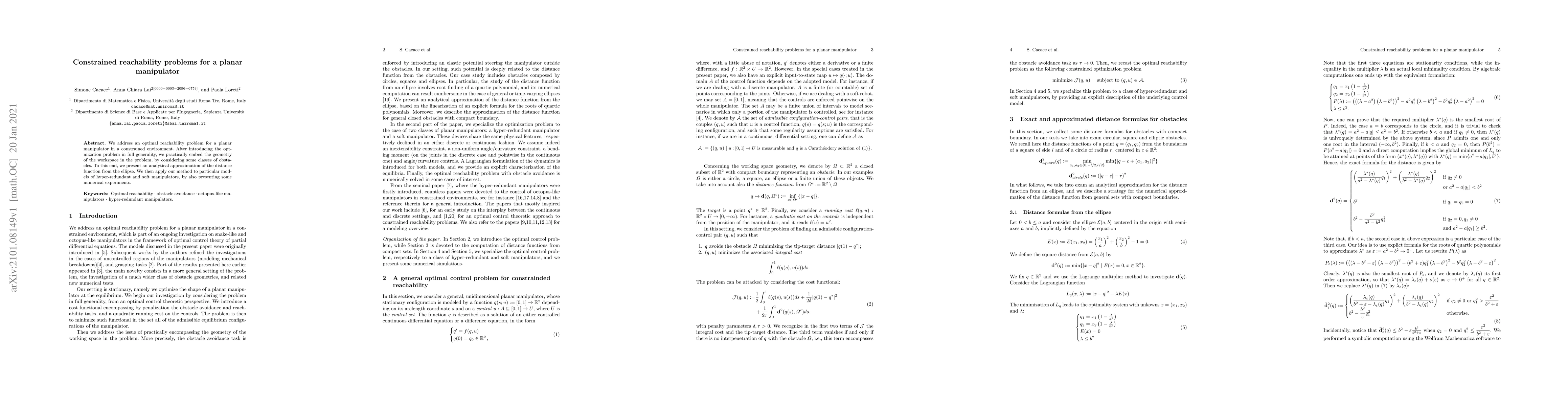 We address an optimal reachability problem for a planar manipulator in a constrained environment. After introducing the optmization problem in full generality, we practically embed the geometry of the workspace in the problem, by considering some classes of obstacles. To this end, we present an analytical approximation of the distance function from the ellipse. We then apply our method to particular models of hyper-redundant and soft manipulators, by also presenting some numerical experiments.