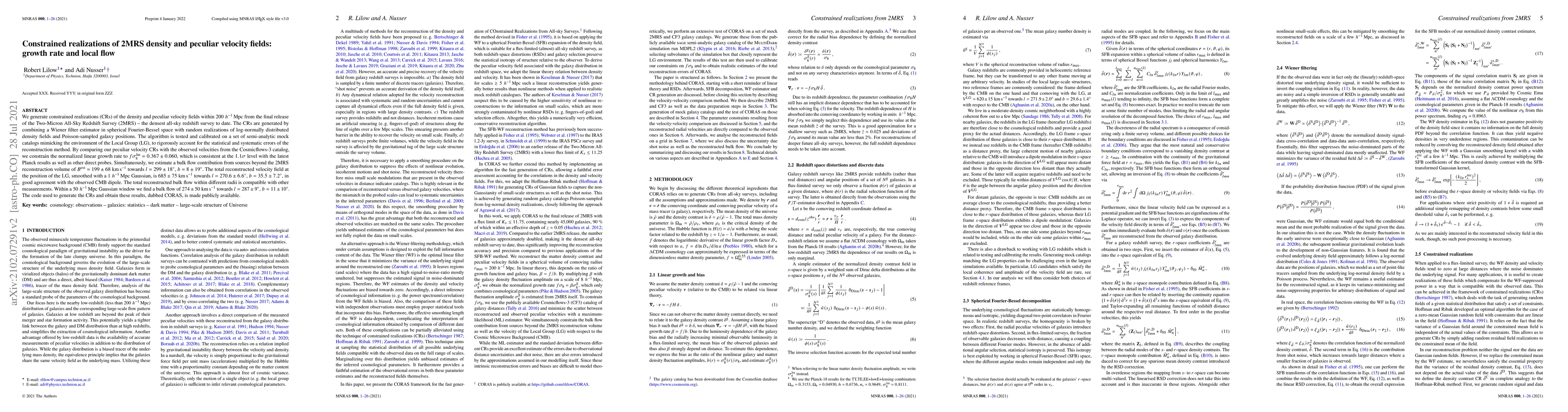This paper generates constrained realizations of the density and peculiar velocity fields from the 2MRS survey, using a Wiener filter and log-normally distributed fields. The study constrains the linear growth rate to $f \sigma_8^\mathrm{lin} = 0.367 \pm 0.060$, consistent with Planck results, and estimates a bulk flow contribution from external sources.