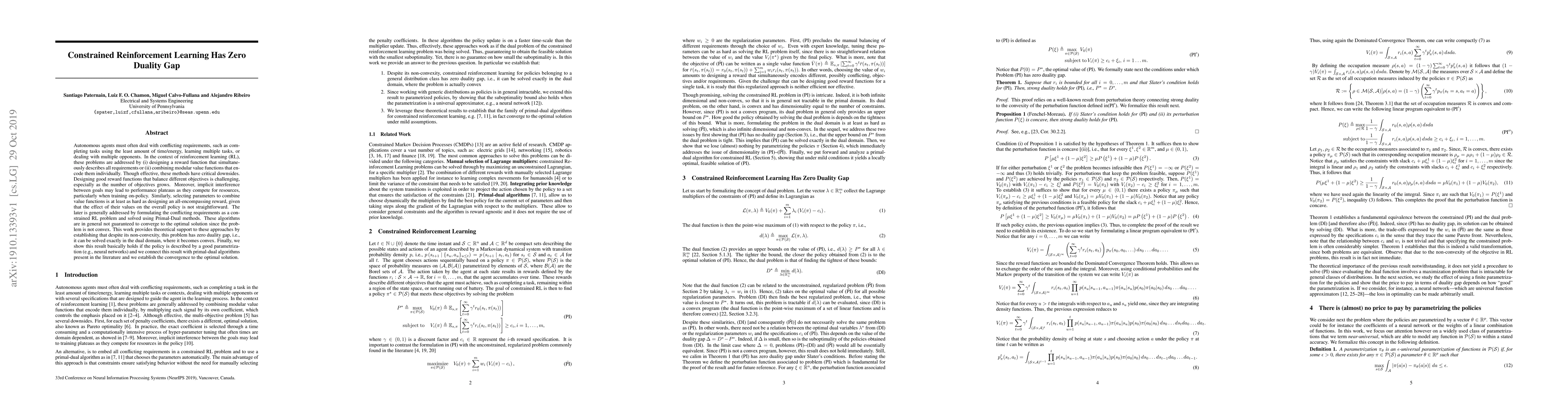 Autonomous agents must often deal with conflicting requirements, such as completing tasks using the least amount of time/energy, learning multiple tasks, or dealing with multiple opponents. In the context of reinforcement learning~(RL), these problems are addressed by (i)~designing a reward function that simultaneously describes all requirements or (ii)~combining modular value functions that encode them individually. Though effective, these methods have critical downsides. Designing good reward functions that balance different objectives is challenging, especially as the number of objectives grows. Moreover, implicit interference between goals may lead to performance plateaus as they compete for resources, particularly when training on-policy. Similarly, selecting parameters to combine value functions is at least as hard as designing an all-encompassing reward, given that the effect of their values on the overall policy is not straightforward. The later is generally addressed by formulating the conflicting requirements as a constrained RL problem and solved using Primal-Dual methods. These algorithms are in general not guaranteed to converge to the optimal solution since the problem is not convex. This work provides theoretical support to these approaches by establishing that despite its non-convexity, this problem has zero duality gap, i.e., it can be solved exactly in the dual domain, where it becomes convex. Finally, we show this result basically holds if the policy is described by a good parametrization~(e.g., neural networks) and we connect this result with primal-dual algorithms present in the literature and we establish the convergence to the optimal solution.