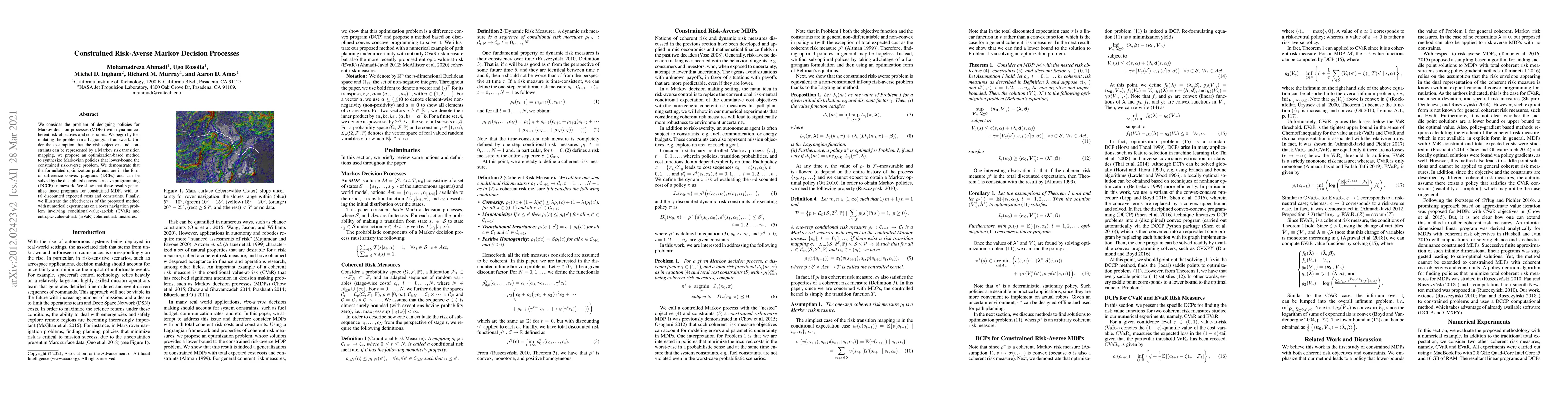 This paper formulates a constrained risk-averse Markov decision process problem in a Lagrangian framework, proposing an optimization-based method to synthesize Markovian policies that minimize dynamic coherent risk objectives. It solves the resulting difference convex programs using disciplined convex-concave programming, and demonstrates the approach through numerical experiments on a rover navigation problem.