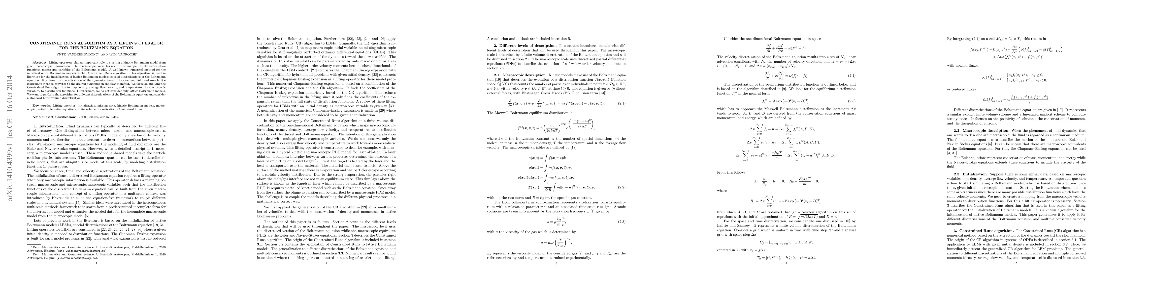 This paper explores the application of the Constrained Runs algorithm as a lifting operator to initialize the Boltzmann equation from macroscopic variables. It aims to map density, average flow velocity, and temperature to distribution functions, extending beyond lattice Boltzmann models to include standard finite volume discretizations.
