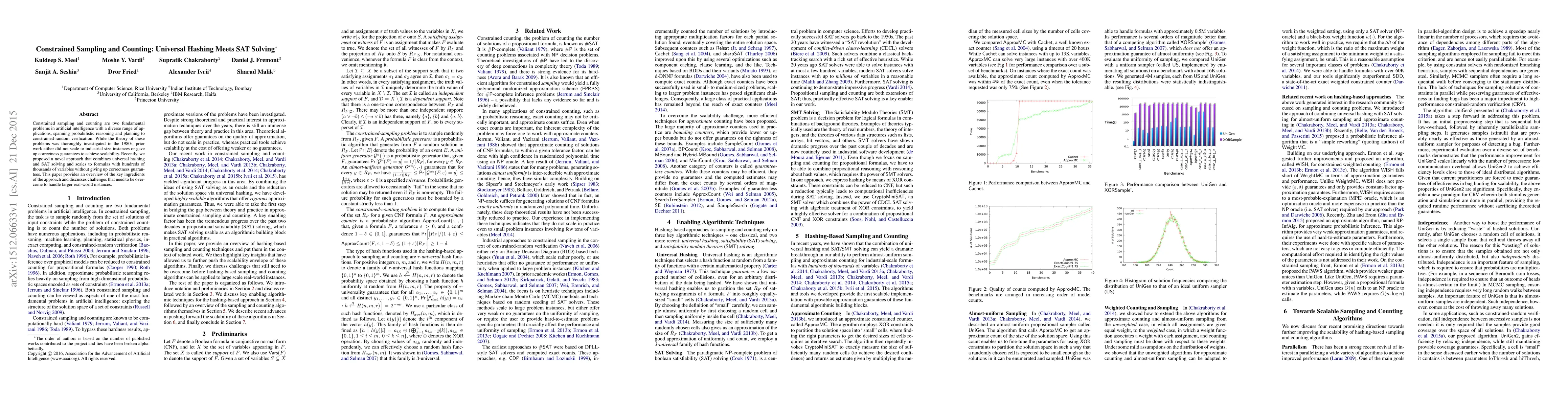 Researchers propose a novel approach combining universal hashing and SAT solving to solve constrained sampling and counting problems, scaling to large industrial instances without sacrificing correctness guarantees.