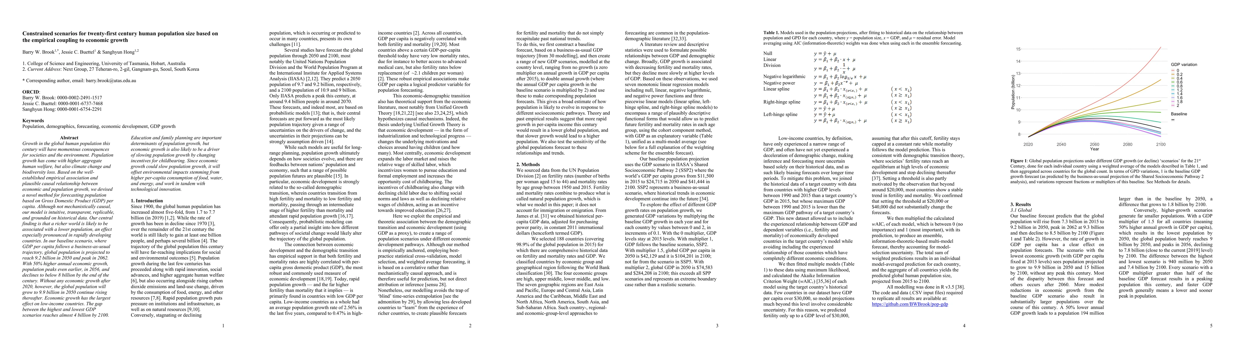 This paper forecasts future human population growth based on the empirical link between economic growth and population size, projecting global population to peak in 2062 under a business-as-usual GDP trajectory, but earlier at 2056 with higher economic growth, and continuing to rise without economic growth. Economic growth, especially in low-income countries, is identified as a significant factor in slowing population growth.