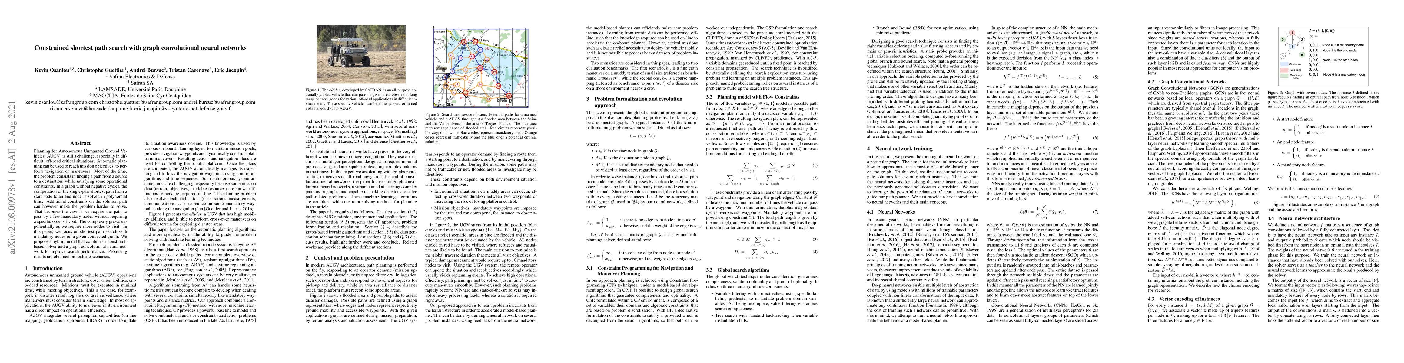 Planning for Autonomous Unmanned Ground Vehicles (AUGV) is still a challenge, especially in difficult, off-road, critical situations. Automatic planning can be used to reach mission objectives, to perform navigation or maneuvers. Most of the time, the problem consists in finding a path from a source to a destination, while satisfying some operational constraints. In a graph without negative cycles, the computation of the single-pair shortest path from a start node to an end node is solved in polynomial time. Additional constraints on the solution path can however make the problem harder to solve. This becomes the case when we need the path to pass through a few mandatory nodes without requiring a specific order of visit. The complexity grows exponentially with the number of mandatory nodes to visit. In this paper, we focus on shortest path search with mandatory nodes on a given connected graph. We propose a hybrid model that combines a constraint-based solver and a graph convolutional neural network to improve search performance. Promising results are obtained on realistic scenarios.