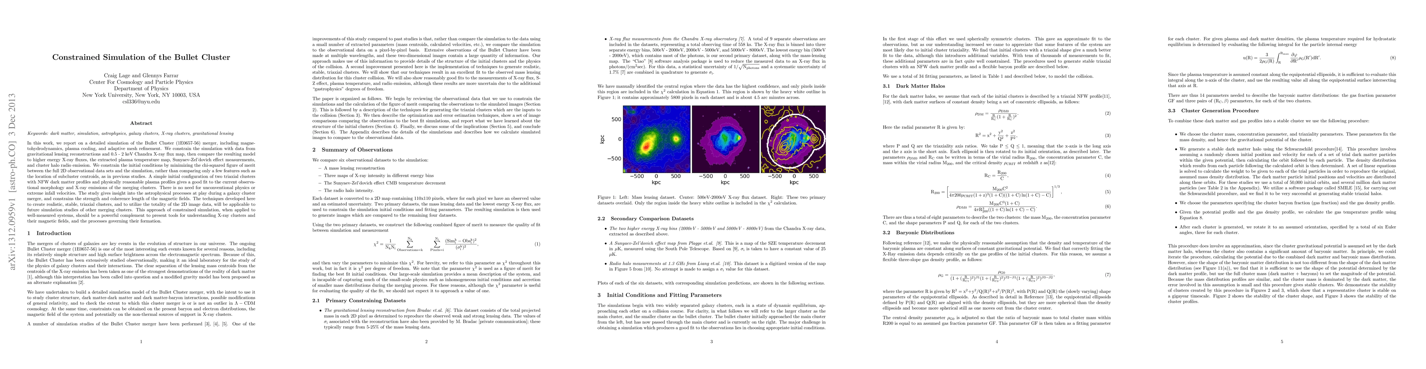 In this work, we report on a detailed simulation of the Bullet Cluster (1E0657-56) merger, including magnetohydrodynamics, plasma cooling, and adaptive mesh refinement. We constrain the simulation with data from gravitational lensing reconstructions and 0.5 - 2 keV Chandra X-ray flux map, then compare the resulting model to higher energy X-ray fluxes, the extracted plasma temperature map, Sunyaev-Zel'dovich effect measurements, and cluster halo radio emission. We constrain the initial conditions by minimizing the chi-squared figure of merit between the full 2D observational data sets and the simulation, rather than comparing only a few features such as the location of subcluster centroids, as in previous studies. A simple initial configuration of two triaxial clusters with NFW dark matter profiles and physically reasonable plasma profiles gives a good fit to the current observational morphology and X-ray emissions of the merging clusters. There is no need for unconventional physics or extreme infall velocities. The study gives insight into the astrophysical processes at play during a galaxy cluster merger, and constrains the strength and coherence length of the magnetic fields. The techniques developed here to create realistic, stable, triaxial clusters, and to utilize the totality of the 2D image data, will be applicable to future simulation studies of other merging clusters. This approach of constrained simulation, when applied to well-measured systems, should be a powerful complement to present tools for understanding X-ray clusters and their magnetic fields, and the processes governing their formation.