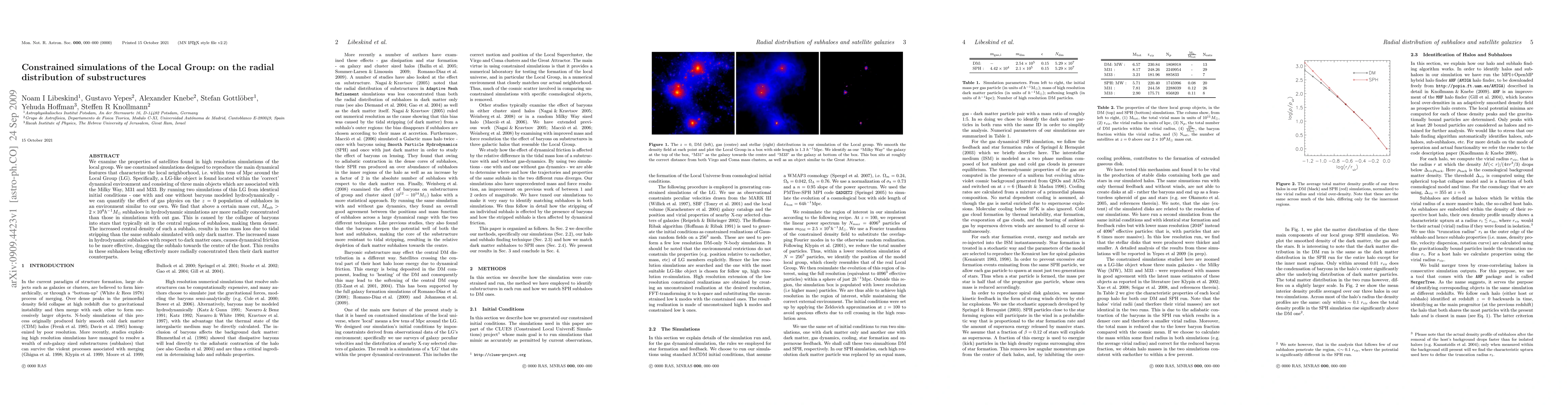 We examine the properties of satellites found in high resolution simulations of the local group. We use constrained simulations designed to reproduce the main dynamical features that characterize the local neighborhood, i.e. within tens of Mpc around the Local Group (LG). Specifically, a LG-like object is found located within the 'correct' dynamical environment and consisting of three main objects which are associated with the Milky Way, M31 and M33. By running two simulations of this LG from identical initial conditions - one with and one without baryons modeled hydrodynamically - we can quantify the effect of gas physics on the $z=0$ population of subhaloes in an environment similar to our own. We find that above a certain mass cut, $M_{\rm sub} > 2\times10^{8}h^{-1} M_{\odot}$ subhaloes in hydrodynamic simulations are more radially concentrated than those in simulations with out gas. This is caused by the collapse of baryons into stars that typically sit in the central regions of subhaloes, making them denser. The increased central density of such a subhalo, results in less mass loss due to tidal stripping than the same subhalo simulated with only dark matter. The increased mass in hydrodynamic subhaloes with respect to dark matter ones, causes dynamical friction to be more effective, dragging the subhalo towards the centre of the host. This results in these subhaloes being effectively more radially concentrated then their dark matter counterparts.
