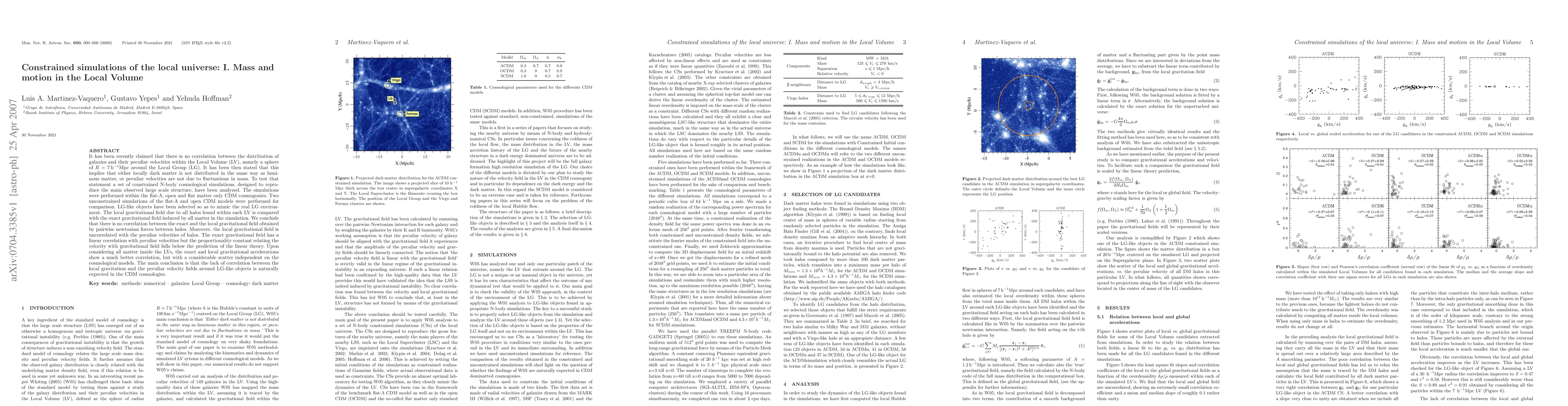 It has been recently claimed that there is no correlation between the distribution of galaxies and their peculiar velocities within the Local Volume (LV), namely a sphere of R=7/h Mpc around the Local Group (LG). It has been then stated that this implies that either locally dark matter is not distributed in the same way as luminous matter, or peculiar velocities are not due to fluctuations in mass. To test that statement a set of constrained N-body cosmological simulations, designed to reproduce the main observed large scale structure, have been analyzed. The simulations were performed within the flat-Lambda, open and flat matter only CDM cosmogonies. Two unconstrained simulations of the flat-Lambda and open CDM models were performed for comparison. LG-like objects have been selected so as to mimic the real LG environment. The local gravitational field due to all halos found within each LV is compared with the exact gravitational field induced by all matter in the simulation. We conclude that there is no correlation between the exact and the local gravitational field obtained by pairwise newtonian forces between halos. Moreover, the local gravitational field is uncorrelated with the peculiar velocities of halos. The exact gravitational field has a linear correlation with peculiar velocities but the proportionality constant relating the velocity with gravitational field falls below the prediction of the linear theory. Upon considering all matter inside the LVs, the exact and local gravitational accelerations show a much better correlation, but with a considerable scatter independent on the cosmological models. The main conclusion is that the lack of correlation between the local gravitation and the peculiar velocity fields around LG-like objects is naturally expected in the CDM cosmologies.