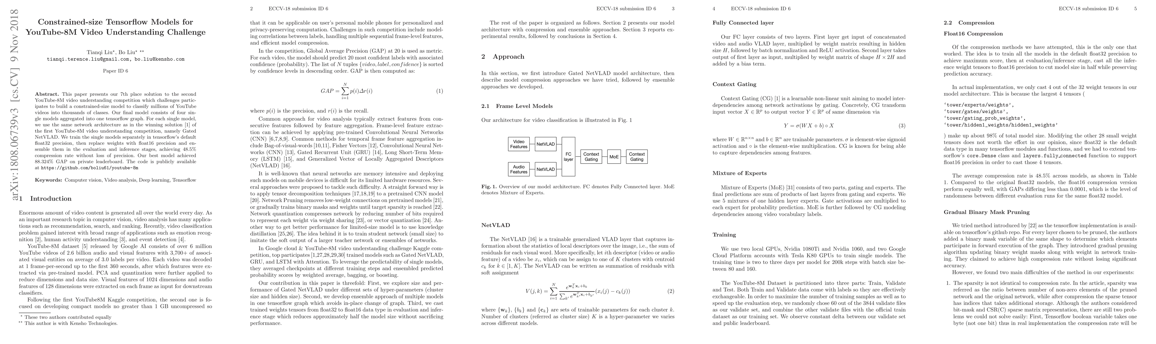 This paper describes a 7th place solution for the YouTube-8M video classification competition, utilizing a constrained-size Tensorflow model that aggregates four Gated NetVLAD networks, achieving a 48.5% compression rate with float16 precision while maintaining 88.324% GAP accuracy. The code is available for public access.