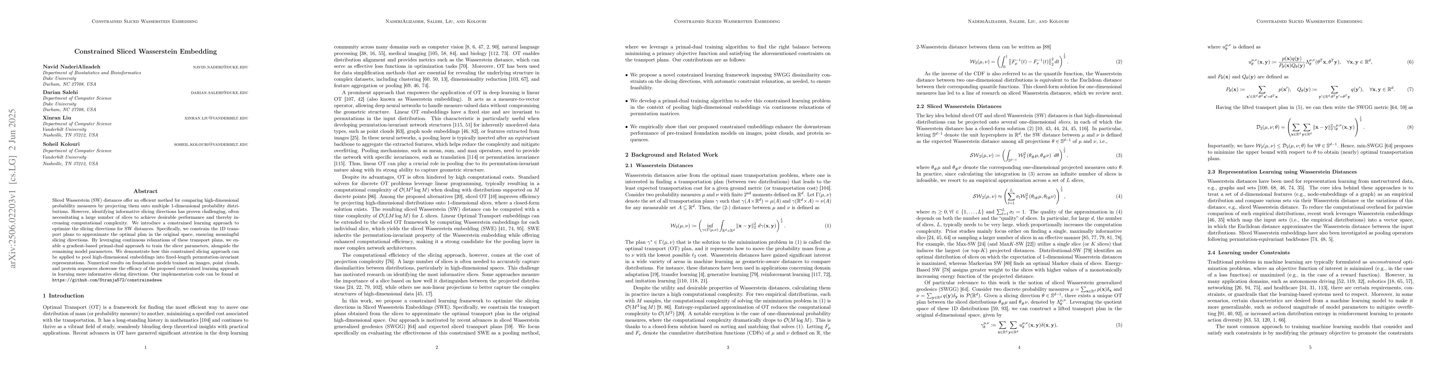 Sliced Wasserstein (SW) distances offer an efficient method for comparing high-dimensional probability measures by projecting them onto multiple 1-dimensional probability distributions. However, identifying informative slicing directions has proven challenging, often necessitating a large number of slices to achieve desirable performance and thereby increasing computational complexity. We introduce a constrained learning approach to optimize the slicing directions for SW distances. Specifically, we constrain the 1D transport plans to approximate the optimal plan in the original space, ensuring meaningful slicing directions. By leveraging continuous relaxations of these transport plans, we enable a gradient-based primal-dual approach to train the slicer parameters, alongside the remaining model parameters. We demonstrate how this constrained slicing approach can be applied to pool high-dimensional embeddings into fixed-length permutation-invariant representations. Numerical results on foundation models trained on images, point clouds, and protein sequences showcase the efficacy of the proposed constrained learning approach in learning more informative slicing directions. Our implementation code can be found at https://github.com/Stranja572/constrainedswe.