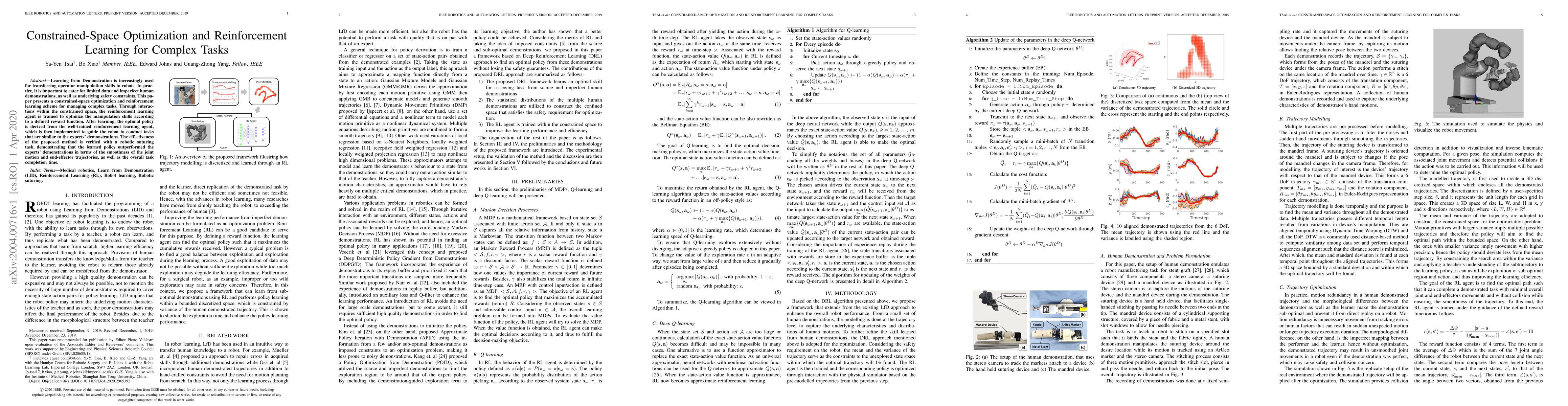 This paper proposes a constrained-space optimization and reinforcement learning framework for robots to learn complex tasks from limited, imperfect demonstrations, optimizing manipulation skills within safety constraints. The method is validated through a robotic suturing task, showing improved performance over expert demonstrations.
