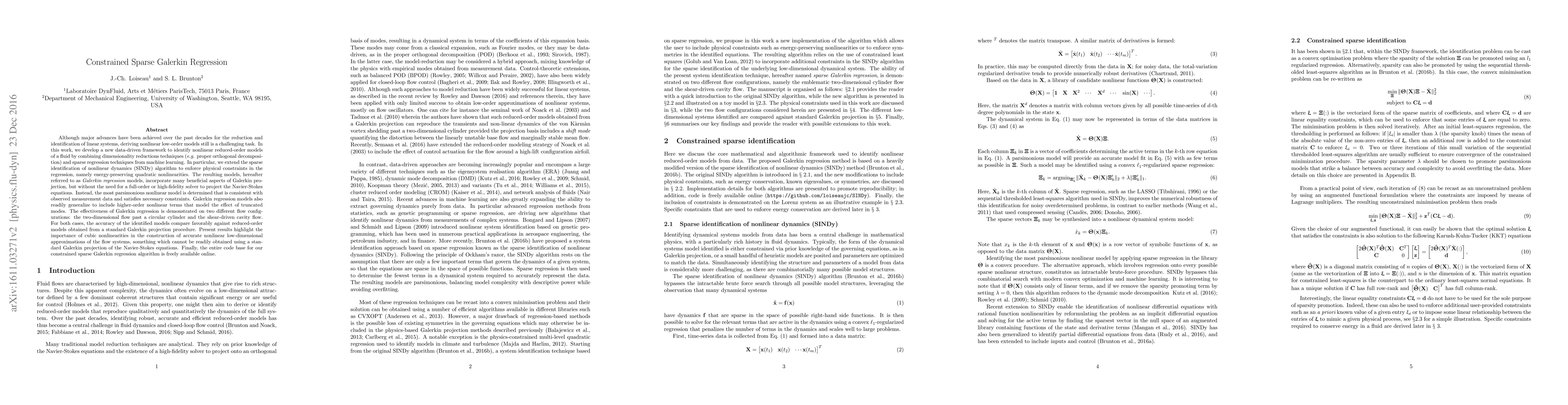 Although major advances have been achieved over the past decades for the reduction and identification of linear systems, deriving nonlinear low-order models still is a chal- lenging task. In this work, we develop a new data-driven framework to identify nonlinear reduced-order models of a fluid by combining dimensionality reductions techniques (e.g. proper orthogonal decomposition) and sparse regression techniques from machine learn- ing. In particular, we extend the sparse identification of nonlinear dynamics (SINDy) algorithm to enforce physical constraints in the regression, namely energy-preserving quadratic nonlinearities. The resulting models, hereafter referred to as Galerkin regression models, incorporate many beneficial aspects of Galerkin projection, but without the need for a full-order or high-fidelity solver to project the Navier-Stokes equations. Instead, the most parsimonious nonlinear model is determined that is consistent with observed mea- surement data and satisfies necessary constraints. Galerkin regression models also readily generalize to include higher-order nonlinear terms that model the effect of truncated modes. The effectiveness of Galerkin regression is demonstrated on two different flow configurations: the two-dimensional flow past a circular cylinder and the shear-driven cavity flow. For both cases, the accuracy of the identified models compare favorably against reduced-order models obtained from a standard Galerkin projection procedure. Present results highlight the importance of cubic nonlinearities in the construction of accurate nonlinear low-dimensional approximations of the flow systems, something which cannot be readily obtained using a standard Galerkin projection of the Navier-Stokes equations. Finally, the entire code base for our constrained sparse Galerkin regression algorithm is freely available online.