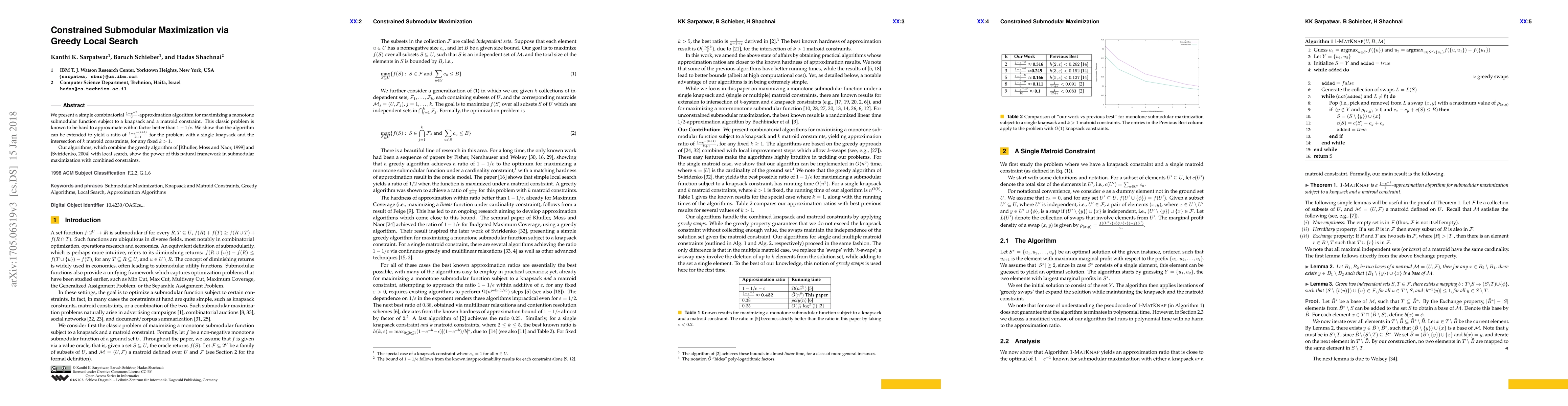 We present a simple combinatorial $\frac{1 -e^{-2}}{2}$-approximation algorithm for maximizing a monotone submodular function subject to a knapsack and a matroid constraint. This classic problem is known to be hard to approximate within factor better than $1 - 1/e$. We show that the algorithm can be extended to yield a ratio of $\frac{1 - e^{-(k+1)}}{k+1}$ for the problem with a single knapsack and the intersection of $k$ matroid constraints, for any fixed $k > 1$. Our algorithms, which combine the greedy algorithm of [Khuller, Moss and Naor, 1999] and [Sviridenko, 2004] with local search, show the power of this natural framework in submodular maximization with combined constraints.