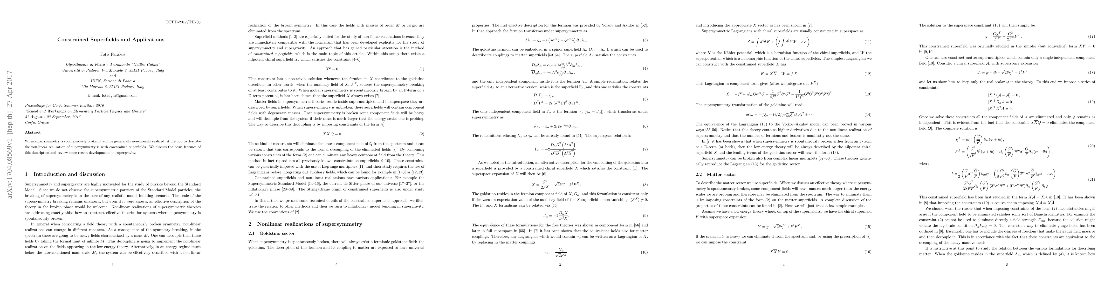 This paper explores the use of constrained superfields to describe the non-linear realization of spontaneously broken supersymmetry. It reviews recent advancements in supergravity within this framework.