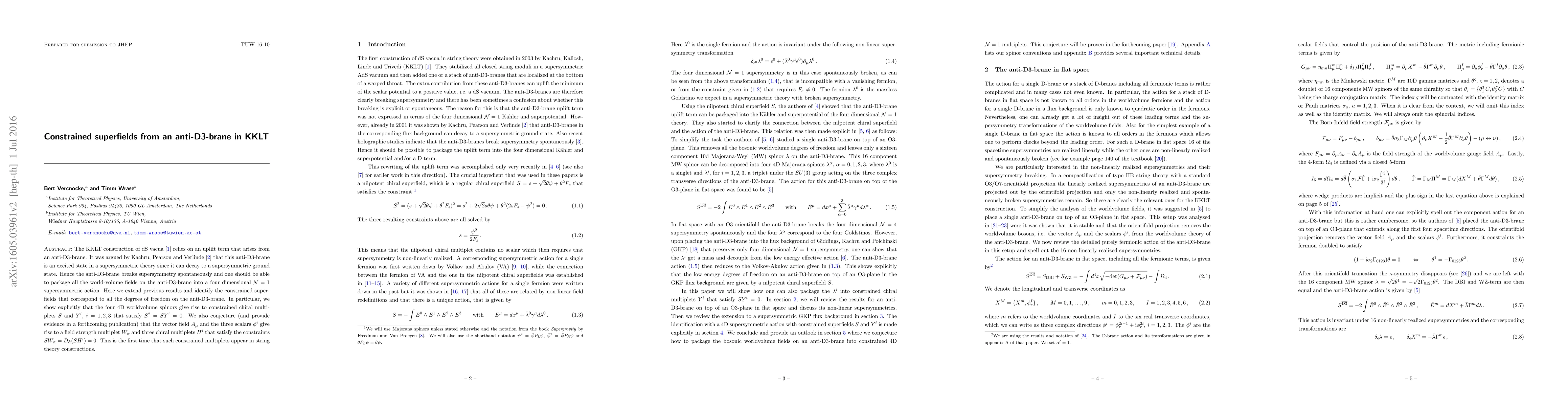 This paper identifies constrained superfields on an anti-D3-brane in the KKLT construction for uplifting dS vacua, demonstrating that four-dimensional worldvolume spinors give rise to chiral multiplets $S$ and $Y^i$ with specific constraints. It also conjectures that vector and scalar fields manifest as a field strength multiplet $W_\alpha$ and chiral multiplets $H^i$ with additional constraints, marking the first appearance of such multiplets in string theory.