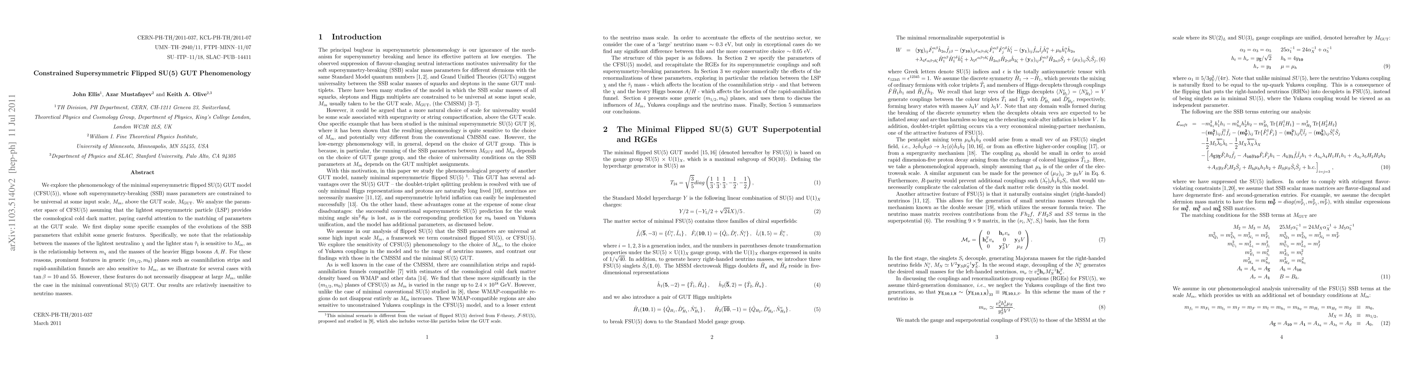 We explore the phenomenology of the minimal supersymmetric flipped SU(5) GUT model (CFSU(5)), whose soft supersymmetry-breaking (SSB) mass parameters are constrained to be universal at some input scale, $M_{in}$, above the GUT scale, $M_{GUT}$. We analyze the parameter space of CFSU(5) assuming that the lightest supersymmetric particle (LSP) provides the cosmological cold dark matter, paying careful attention to the matching of parameters at the GUT scale. We first display some specific examples of the evolutions of the SSB parameters that exhibit some generic features. Specifically, we note that the relationship between the masses of the lightest neutralino and the lighter stau is sensitive to $M_{in}$, as is the relationship between the neutralino mass and the masses of the heavier Higgs bosons. For these reasons, prominent features in generic $(m_{1/2}, m_0)$ planes such as coannihilation strips and rapid-annihilation funnels are also sensitive to $M_{in}$, as we illustrate for several cases with tan(beta)=10 and 55. However, these features do not necessarily disappear at large $M_{in}$, unlike the case in the minimal conventional SU(5) GUT. Our results are relatively insensitive to neutrino masses.