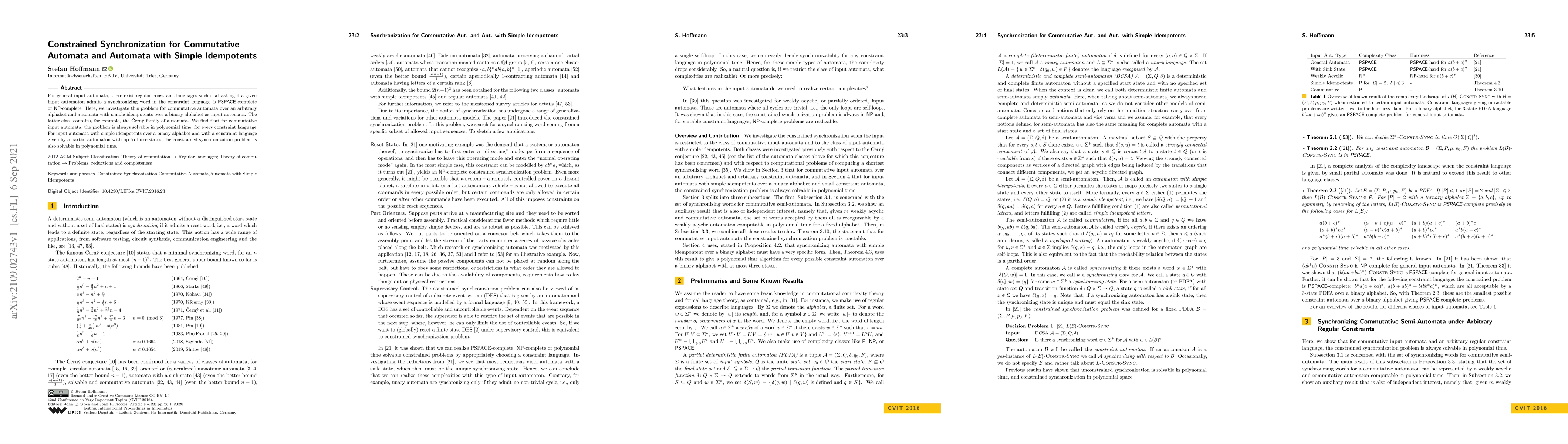 This paper investigates the complexity of constrained synchronization for commutative automata and automata with simple idempotents. It finds that synchronization for commutative automata is polynomial-time solvable, while for automata with simple idempotents over a binary alphabet, it is also polynomial-time solvable under specific constraint conditions.