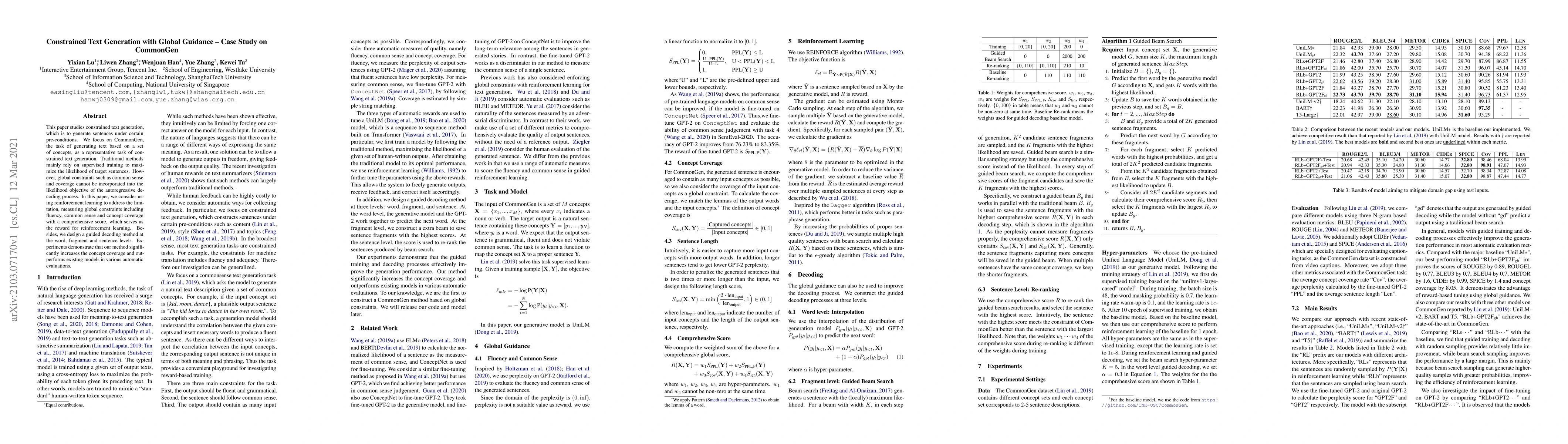 This paper explores constrained text generation using reinforcement learning to incorporate global constraints like fluency and common sense into a guided decoding method. It demonstrates significant improvements in concept coverage over existing models through its innovative approach.