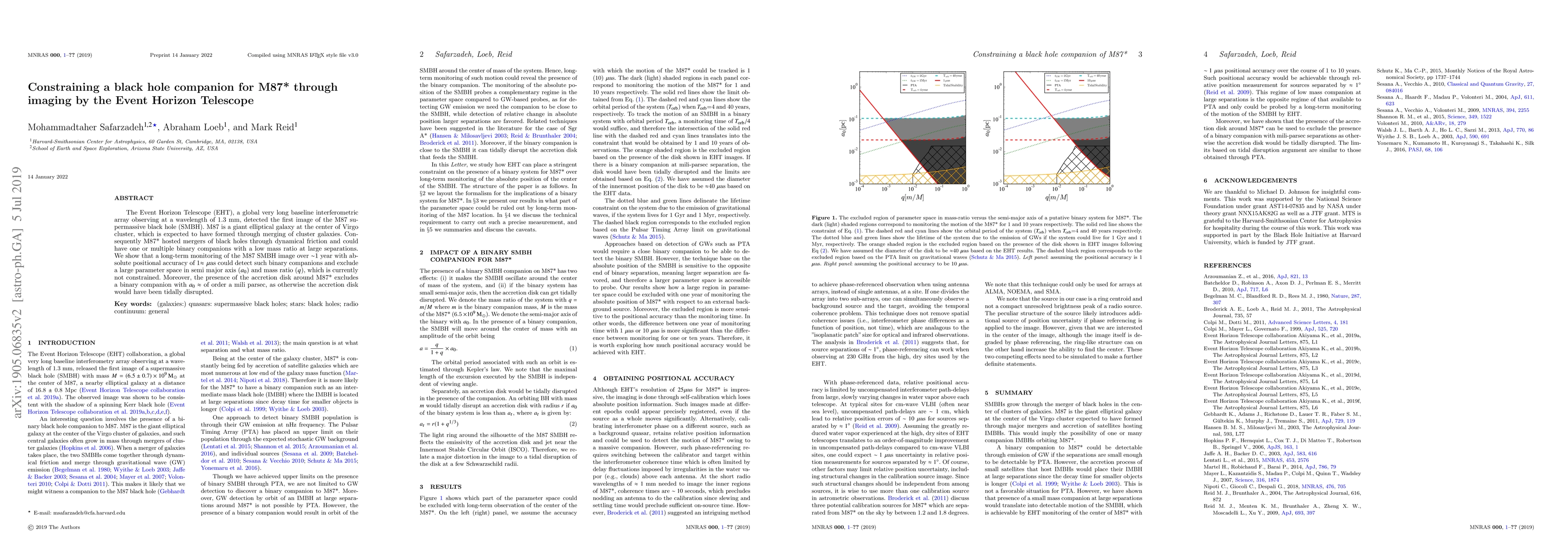 The Event Horizon Telescope detected a binary companion to M87* with high precision monitoring, constraining large parameter spaces for semi-major axis and mass ratio, and excluding smaller companions due to accretion disk disruption.