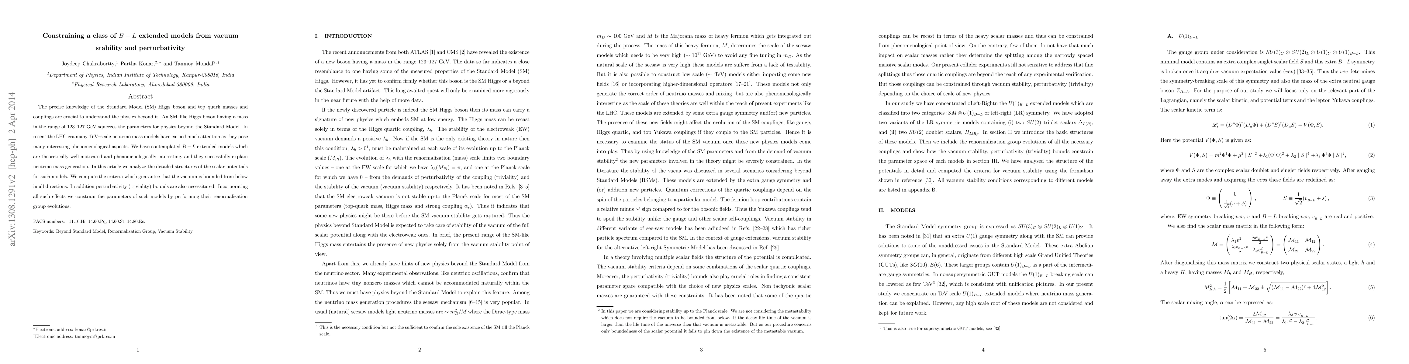 Researchers constrained B-L extended models from vacuum stability and perturbativity constraints to understand the physics beyond the Standard Model. They analyzed scalar potentials, computed bounds on model parameters, and performed renormalization group evolutions.