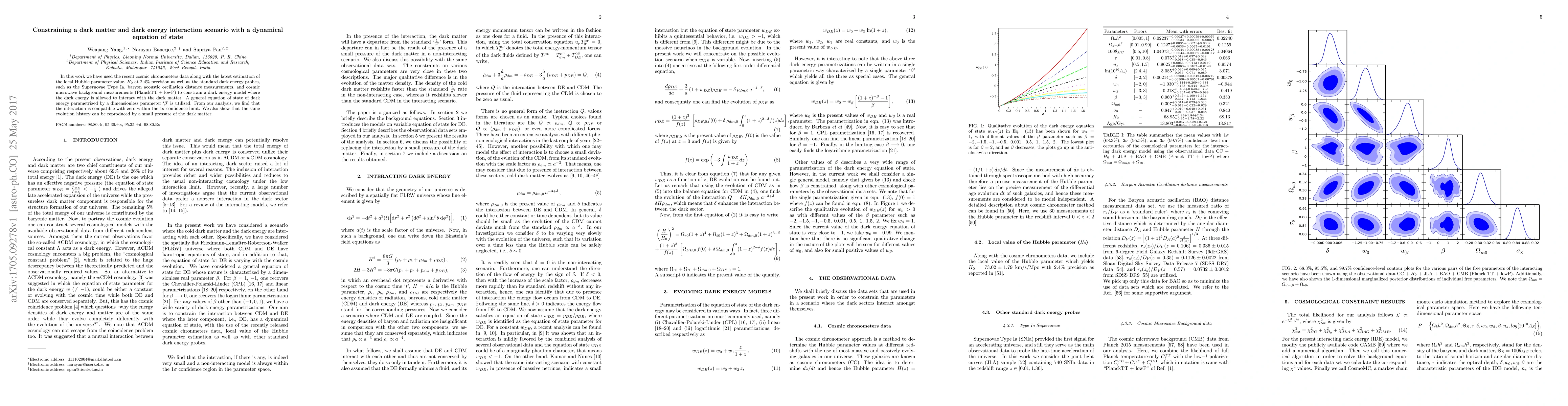 In this work we have used the recent cosmic chronometers data along with the latest estimation of the local Hubble parameter value, $H_0$ at 2.4\% precision as well as the standard dark energy probes, such as the Supernovae Type Ia, baryon acoustic oscillation distance measurements, and cosmic microwave background measurements (PlanckTT $+$ lowP) to constrain a dark energy model where the dark energy is allowed to interact with the dark matter. A general equation of state of dark energy parametrized by a dimensionless parameter `$\beta$' is utilized. From our analysis, we find that the interaction is compatible with zero within the 1$\sigma$ confidence limit. We also show that the same evolution history can be reproduced by a small pressure of the dark matter.
