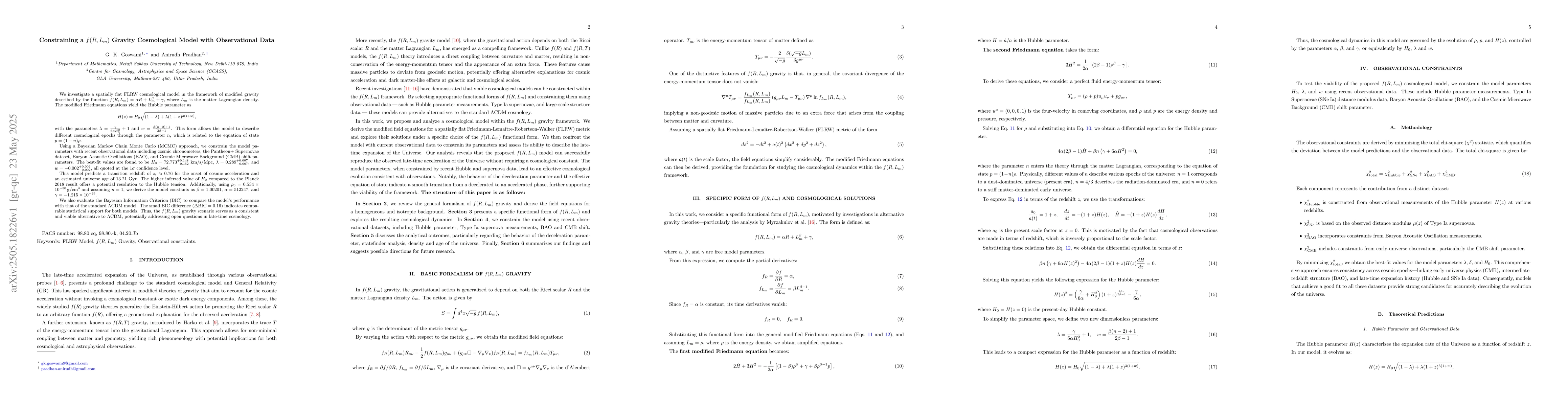 Development of a cosmological model using \( f(R, L_m) \) that accounts for different cosmological epochs and is constrained using MCMC analysis with multiple observational datasets.