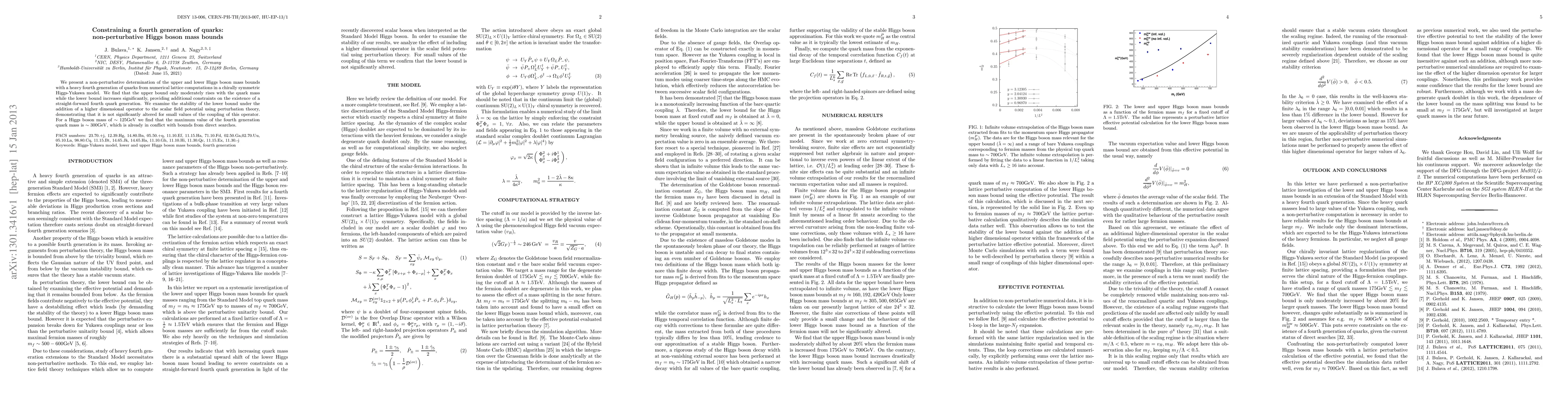 This paper provides non-perturbative bounds on the Higgs boson mass considering a fourth generation of quarks, revealing that the upper bound rises moderately while the lower bound increases significantly with quark mass. The study finds that the maximum fourth generation quark mass is around 300 GeV, conflicting with direct search limits.