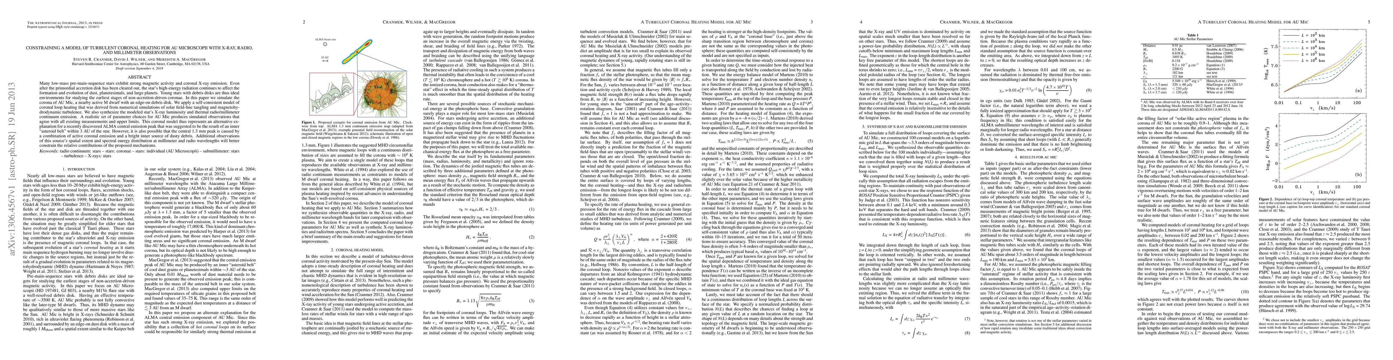 Many low-mass pre-main-sequence stars exhibit strong magnetic activity and coronal X-ray emission. Even after the primordial accretion disk has been cleared out, the star's high-energy radiation continues to affect the formation and evolution of dust, planetesimals, and large planets. Young stars with debris disks are thus ideal environments for studying the earliest stages of non-accretion-driven coronae. In this paper we simulate the corona of AU Mic, a nearby active M dwarf with an edge-on debris disk. We apply a self-consistent model of coronal loop heating that was derived from numerical simulations of solar field-line tangling and magnetohydrodynamic turbulence. We also synthesize the modeled star's X-ray luminosity and thermal radio/millimeter continuum emission. A realistic set of parameter choices for AU Mic produces simulated observations that agree with all existing measurements and upper limits. This coronal model thus represents an alternative explanation for a recently discovered ALMA central emission peak that was suggested to be the result of an inner "asteroid belt" within 3 AU of the star. However, it is also possible that the central 1.3 mm peak is caused by a combination of active coronal emission and a bright inner source of dusty debris. Additional observations of this source's spatial extent and spectral energy distribution at millimeter and radio wavelengths will better constrain the relative contributions of the proposed mechanisms.