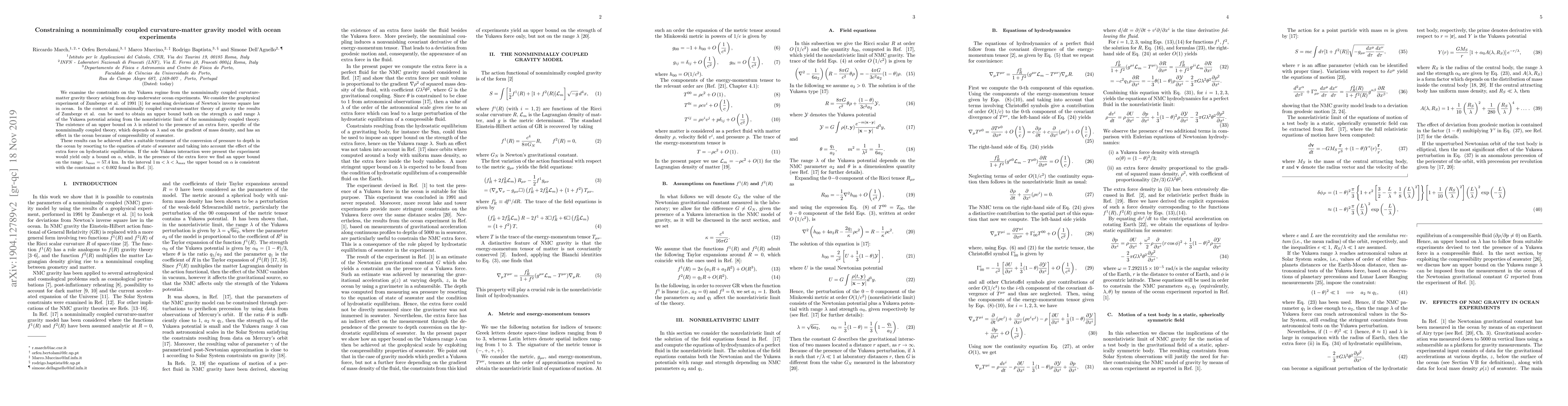 This paper explores the constraints on a nonminimally coupled curvature-matter gravity model using oceanographic experiments, specifically the 1991 Zumberge et al. study. The analysis yields an upper bound on both the strength $\alpha$ and the range $\lambda$ of the Yukawa potential, with $\lambda_{\rm max}$ determined to be 57.4 km, due to an extra force dependent on $\lambda$ and the gradient of mass density.