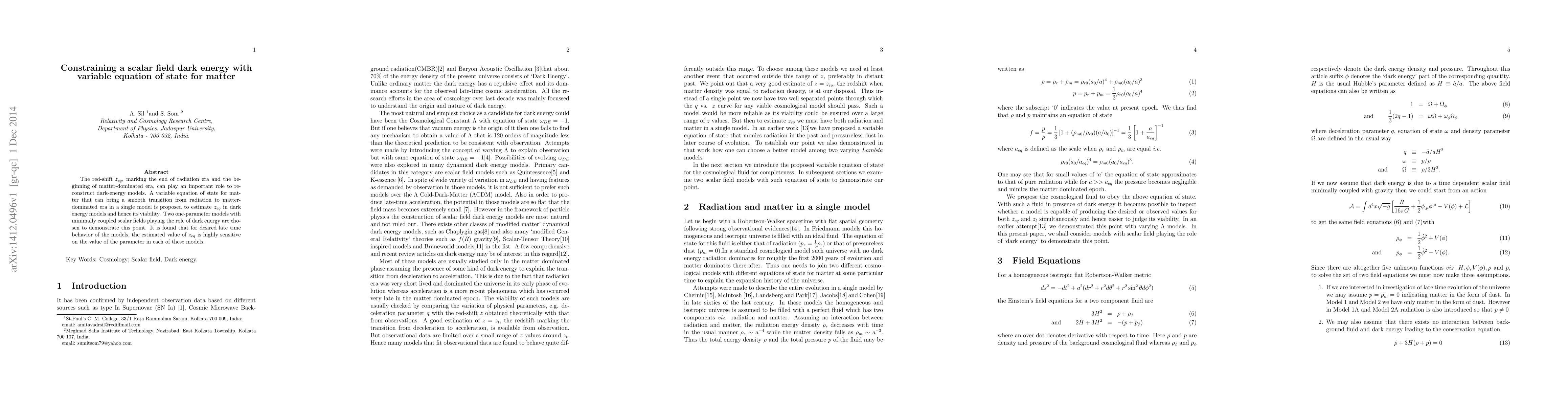 This paper proposes a variable equation of state for matter to estimate the redshift marking the transition from radiation to matter-dominated era, using two one-parameter scalar field dark energy models. The study finds that the estimated redshift value is highly sensitive to the model parameters, impacting the viability of dark energy models.