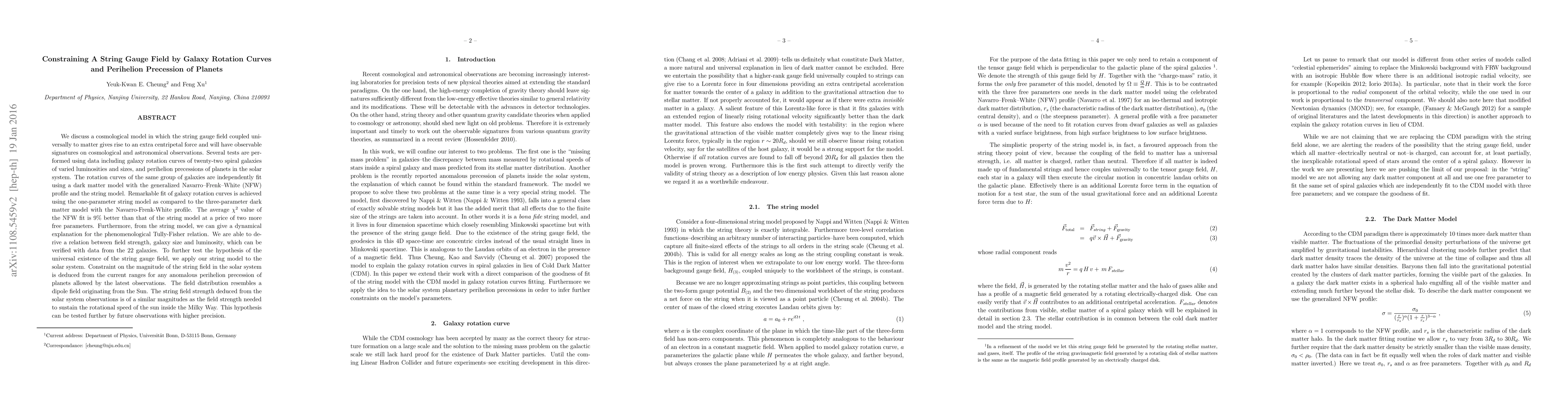 We discuss a cosmological model in which the string gauge field coupled universally to matter gives rise to an extra centripetal force and will have observable signatures on cosmological and astronomical observations. Several tests are performed using data including galaxy rotation curves of 22 spiral galaxies of varied luminosities and sizes, and perihelion precessions of planets in the solar system. The rotation curves of the same group of galaxies are independently fit using a dark matter model with the generalized Navarro--Frenk--White (NFW) profile and the string model. A Remarkable fit of galaxy rotation curves is achieved using the one-parameter string model as compared to the three-parameter dark matter model with the NFW profile. The average $\chi^2$ value of the NFW fit is 9\% better than that of the string model at a price of two more free parameters. Furthermore, from the string model, we can give a dynamical explanation for the phenomenological Tully-Fisher relation. We are able to derive a relation between field strength, galaxy size and luminosity, which can be verified with data from the 22 galaxies. To further test the hypothesis of the universal existence of the string gauge field, we apply our string model to the solar system. Constraint on the magnitude of the string field in the solar system is deduced from the current ranges for any anomalous perihelion precession of planets allowed by the latest observations. The field distribution resembles a dipole field originating from the Sun. The string field strength deduced from the solar system observations is of a similar magnitude as the field strength needed to sustain the rotational speed of the Sun inside the Milky Way. This hypothesis can be tested further by future observations with higher precision.