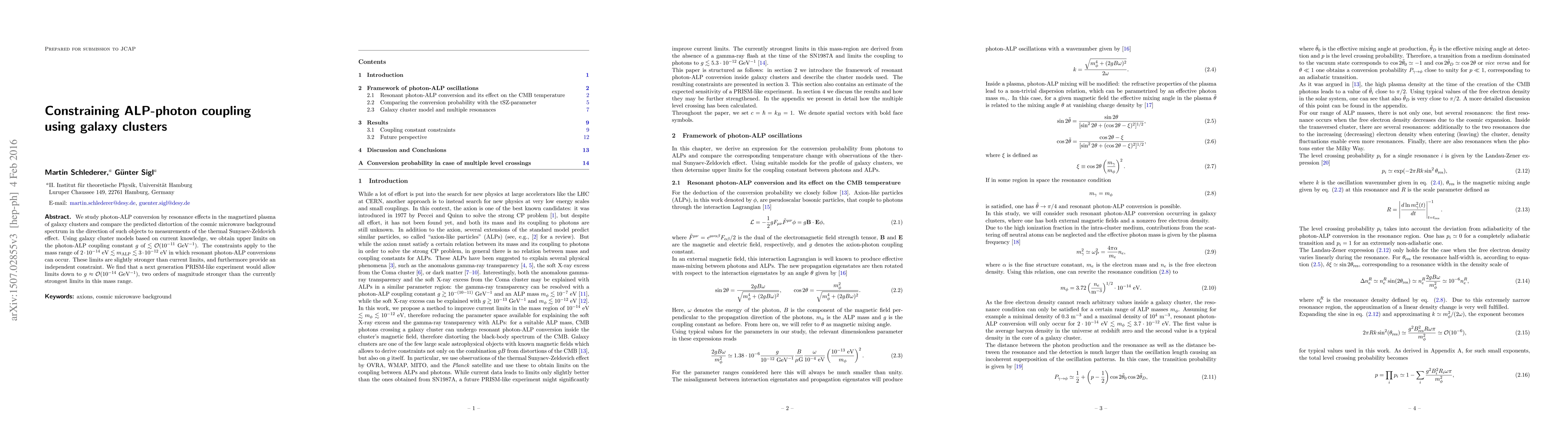 This paper constrains the photon-ALP coupling constant using galaxy clusters' magnetized plasma, achieving limits of $g \lesssim \mathcal{O}(10^{-11})$ GeV$^{-1}$ for ALP masses in the range $2\cdot 10^{-14}$ to $3\cdot 10^{-12}$ eV. Future experiments could improve these limits by two orders of magnitude.
