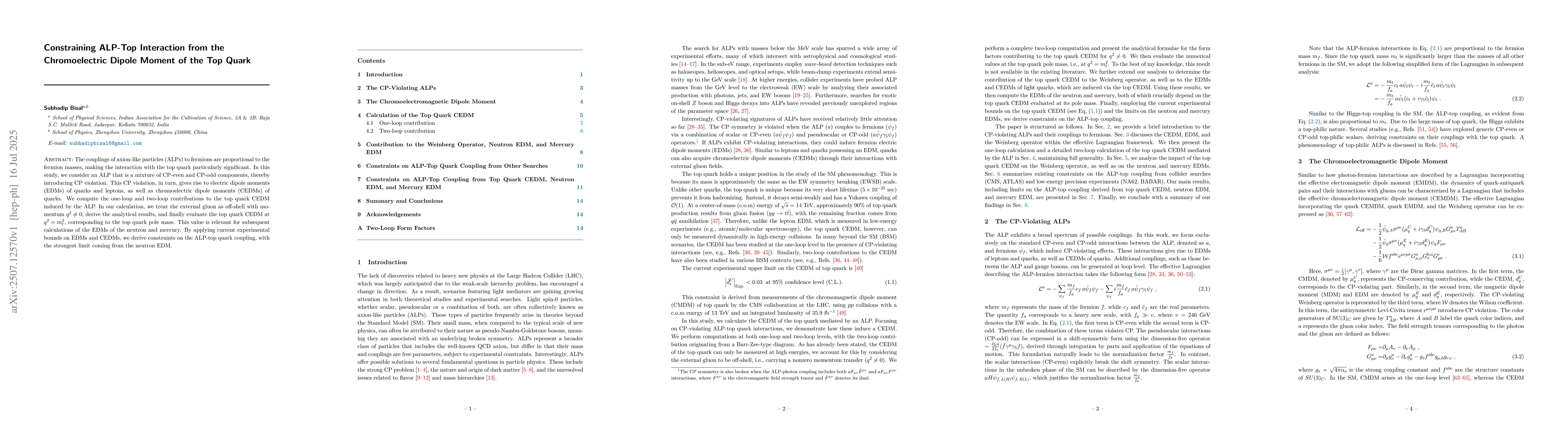 This research calculates top quark chromoelectric dipole moment (CEDM) induced by axion-like particles (ALPs), introducing CP violation. Constraints on ALP-top quark coupling are derived using current experimental bounds on EDMs and CEDMs, with the strongest limit from the neutron EDM.