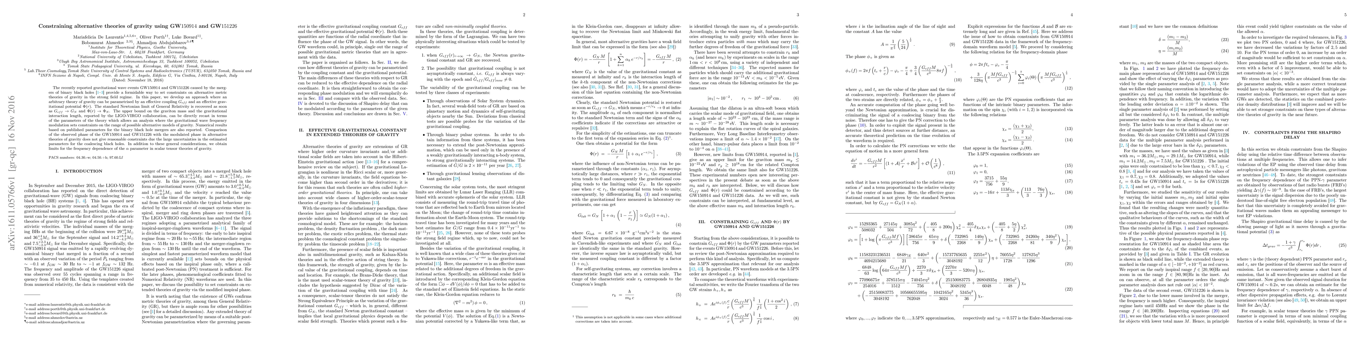 This paper develops a method to constrain alternative theories of gravity using gravitational wave events GW$150914$ and GW$151226$ from binary black hole mergers, showing how these can be parametrized by effective coupling and potential. Despite large uncertainties, the analysis provides limits on the frequency dependence of the $\alpha$ parameter in scalar tensor theories.