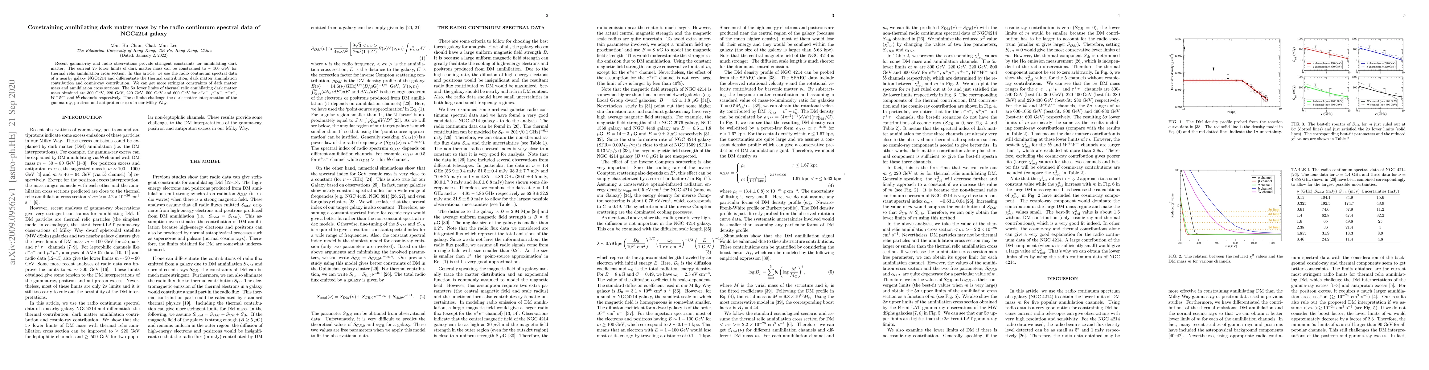 This paper uses radio continuum spectral data from the galaxy NGC4214 to constrain the mass of annihilating dark matter, achieving $5\sigma$ lower limits of 300 GeV to 600 GeV for various annihilation channels, which challenge existing interpretations of gamma-ray and positron excesses.