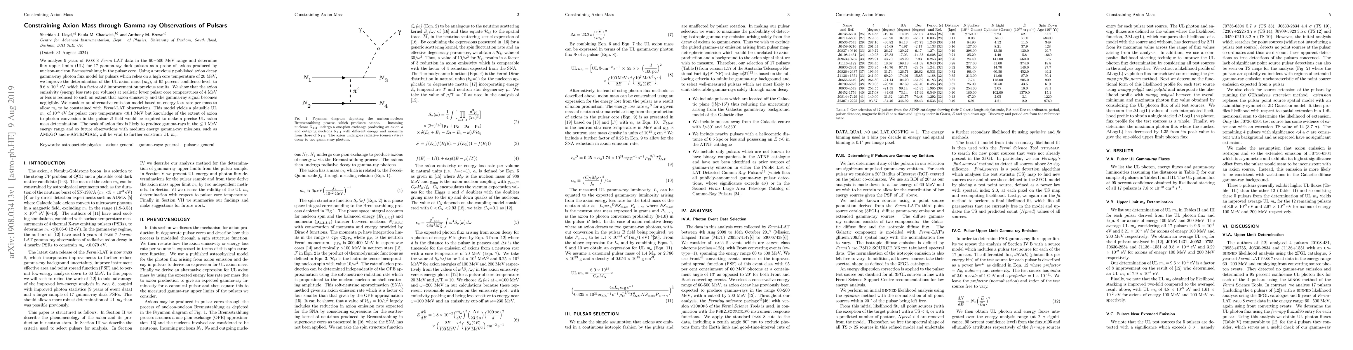 We analyze 9 years of PASS 8 $\textit{Fermi}$-LAT data in the 60$-$500 MeV range and determine flux upper limits (UL) for 17 gamma-ray dark pulsars as a probe of axions produced by nucleon-nucleon Bremsstrahlung in the pulsar core. Using a previously published axion decay gamma-ray photon flux model for pulsars which relies on a high core temperature of 20 MeV, we improve the determination of the UL axion mass ($m_a$), at 95 percent confidence level, to 9.6 $\times$ 10$^{-3}$ eV, which is a factor of 8 improvement on previous results. We show that the axion emissivity (energy loss rate per volume) at realistic lower pulsar core temperatures of 4 MeV or less is reduced to such an extent that axion emissivity and the gamma-ray signal becomes negligible. We consider an alternative emission model based on energy loss rate per mass to allow $m_a$ to be constrained with $Fermi$-LAT observations. This model yields a plausible UL $m_a$ of 10$^{-6}$ eV for pulsar core temperature $<$ 0.1 MeV but knowledge of the extent of axion to photon conversion in the pulsar $B$ field would be required to make a precise UL axion mass determination. The peak of axion flux is likely to produce gamma-rays in the $\leq$ 1 MeV energy range and so future observations with medium energy gamma-ray missions, such as AMEGO and e-ASTROGAM, will be vital to further constrain UL $m_a$.