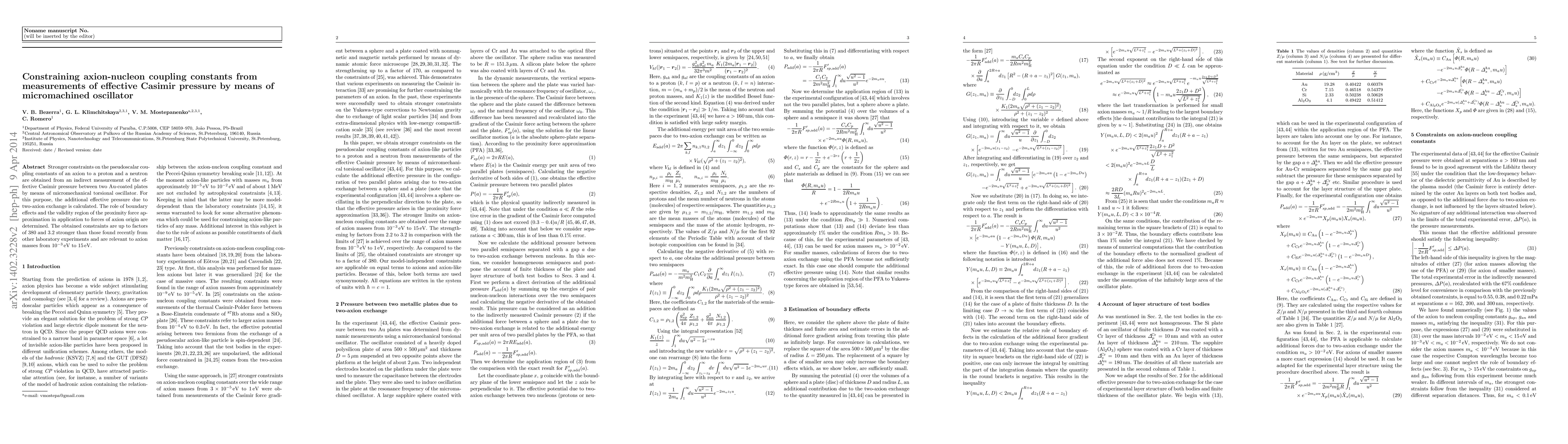 Stronger constraints on the pseudoscalar coupling constants of an axion to a proton and a neutron are obtained from an indirect measurement of the effective Casimir pressure between two Au-coated plates by means of micromechanical torsional oscillator. For this purpose, the additional effective pressure due to two-axion exchange is calculated. The role of boundary effects and the validity region of the proximity force approximation in application to forces of axion origin are determined. The obtained constraints are up to factors of 380 and 3.15 stronger than those found recently from other laboratory experiments and are relevant to axion masses from $10^{-3}$eV to 15eV.